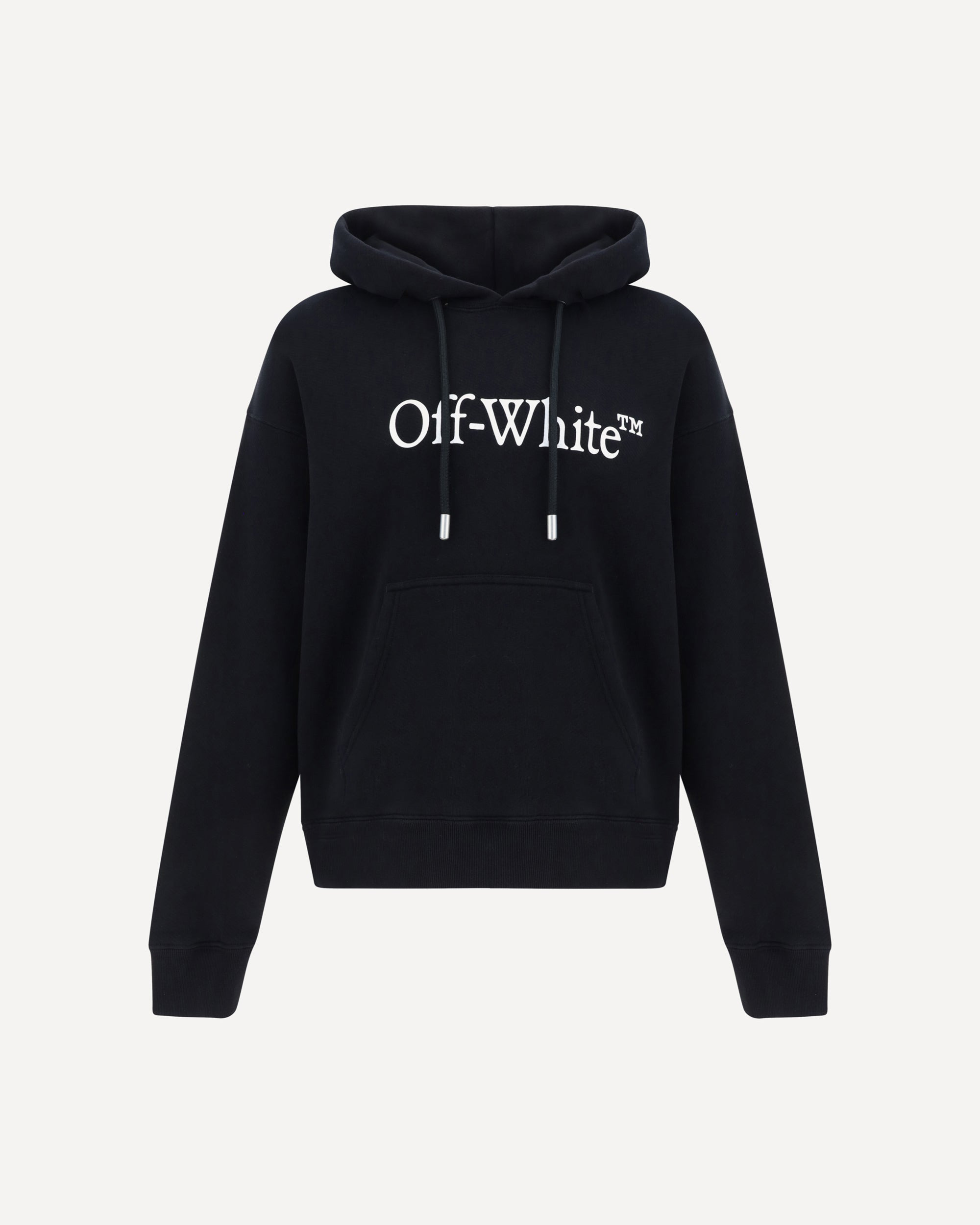 Cotton Big Bookish Skate Hoodie by Off-White, features hood with adjustable drawstring, ribbed cuffs, ribbed hem, front kangaroo pocket, iconic brand monogram printed in contrasting color on front, regular fit. DETAILS sku OMBB085C99FLE012_1001 composition: COTTON 100% color group: BLACK gender: MAN season: AW24 size chart: STANDARD category name: SWEATSHIRTS