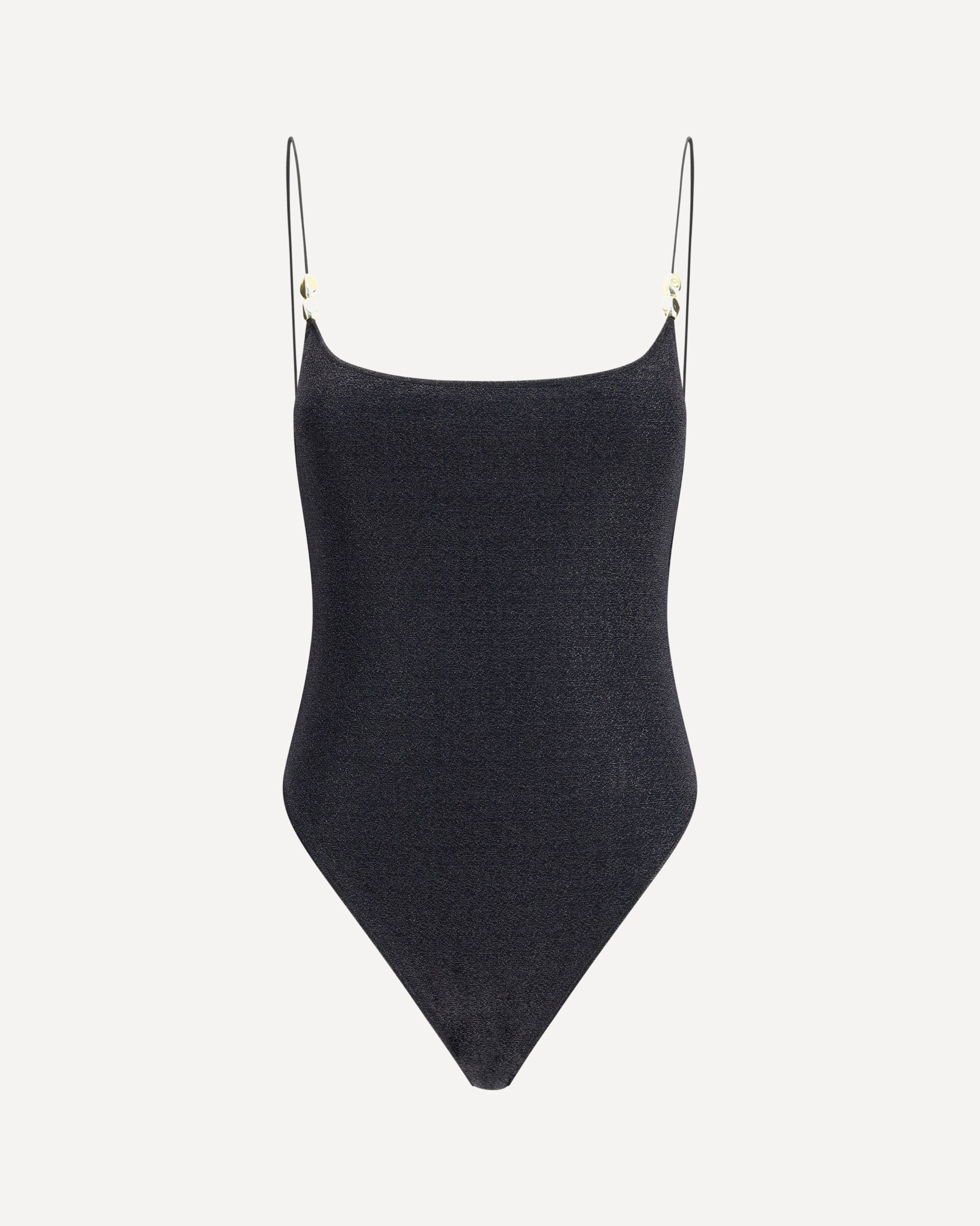 The Glazed Lumiere One Piece Swimsuit by Oseree combines elegance and modernity with its shiny lame fabric and sophisticated silhouette. Featuring a square neckline at the front and a deep neckline at the back, it tastefully enhances the silhouette. The straps are embellished with gold nuggets, a precious detail that reflects the brand's refined aesthetic. DETAILS - Sku: LZIF257_BLACK - Season: AW25 - Fit: Regular - Composition: GENERAL 64% Polyamide 36% Other Fibres - MADE IN ITALY