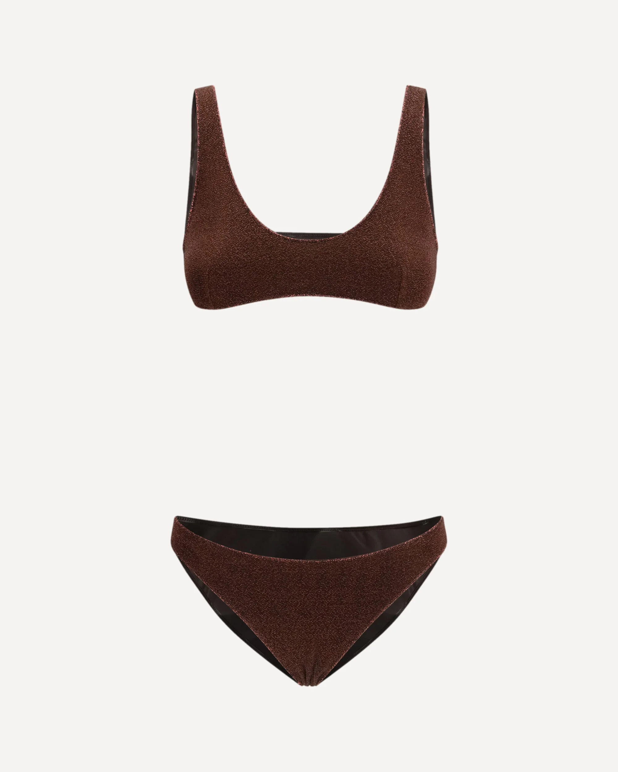 The Lumiere Sporty Swimsuit by Oseree is a perfect choice for those seeking a balance between sporty style and a touch of glamour. The bandeau top offers secure support thanks to the removable shoulder straps, combining functionality and comfort. The sporty design is emphasized by the simple and chic structure, while the all-over glitter pattern adds a subtle and sophisticated shine, catching the light in an elegant way. This swimsuit is ideal for those who want a dynamic and modern look, without sacrificing a touch of luxury, perfect for the pool or the beach, but also for those looking for a holiday outfit that does not go unnoticed. DETAILS - Sku: LSS205_CHOCOLATE - Season: SS26 - Fit: Regular - Composition: GENERAL 64% Polyamide 36% Metal Metallic Metallised - MADE IN ITALY
