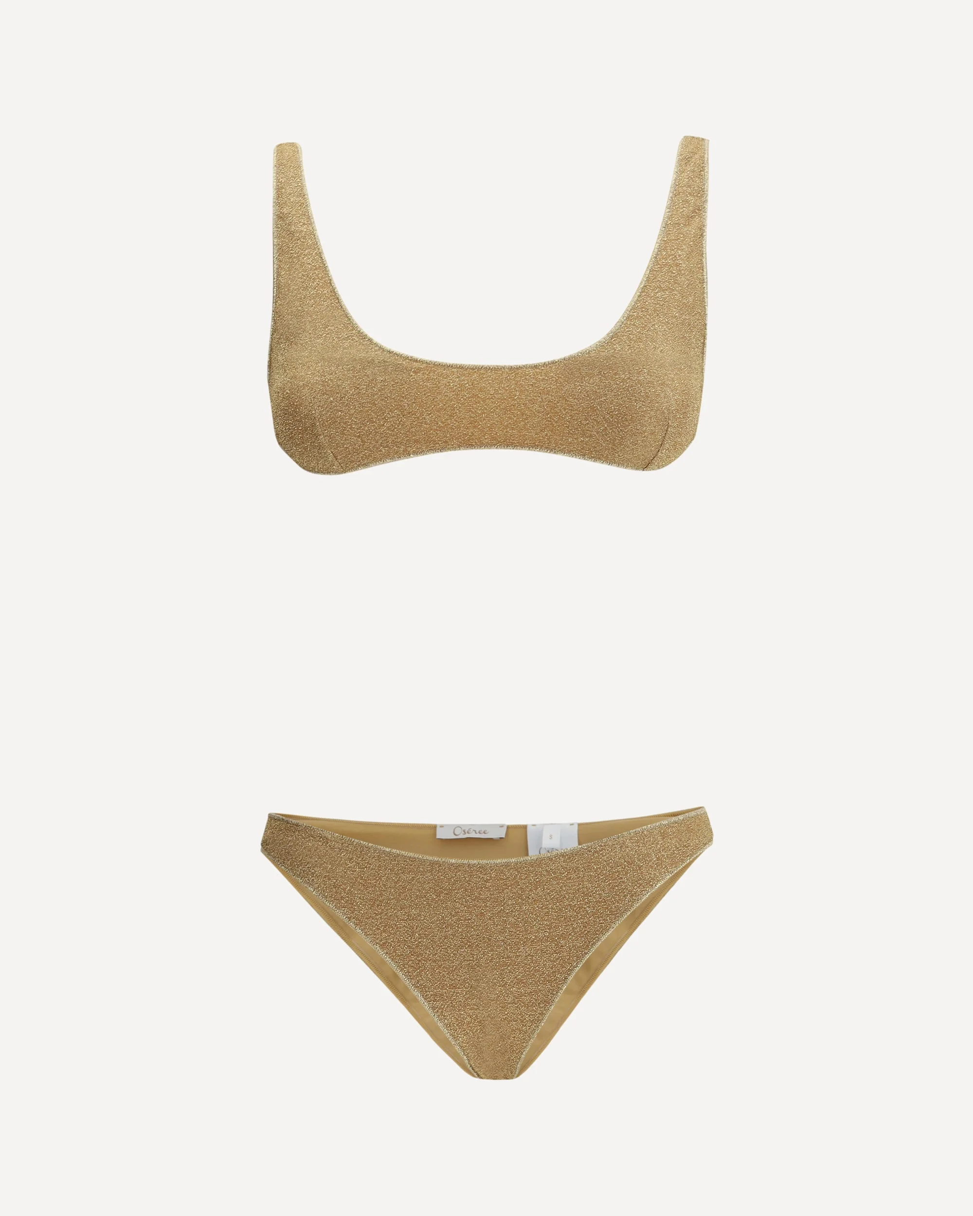 The Lumiere Sporty Swimsuit by Oseree is a perfect choice for those seeking a balance between sporty style and a touch of glamour. The bandeau top offers secure support thanks to the removable shoulder straps, combining functionality and comfort. The sporty design is emphasized by the simple and chic structure, while the all-over glitter pattern adds a subtle and sophisticated shine, catching the light in an elegant way. This swimsuit is ideal for those who want a dynamic and modern look, without sacrificing a touch of luxury, perfect for the pool or the beach, but also for those looking for a holiday outfit that does not go unnoticed. DETAILS - Sku: LSS205_GOLD - Season: SS26 - Fit: Regular - Composition: GENERAL 64% Polyamide 36% Metal Metallic Metallised - MADE IN ITALY