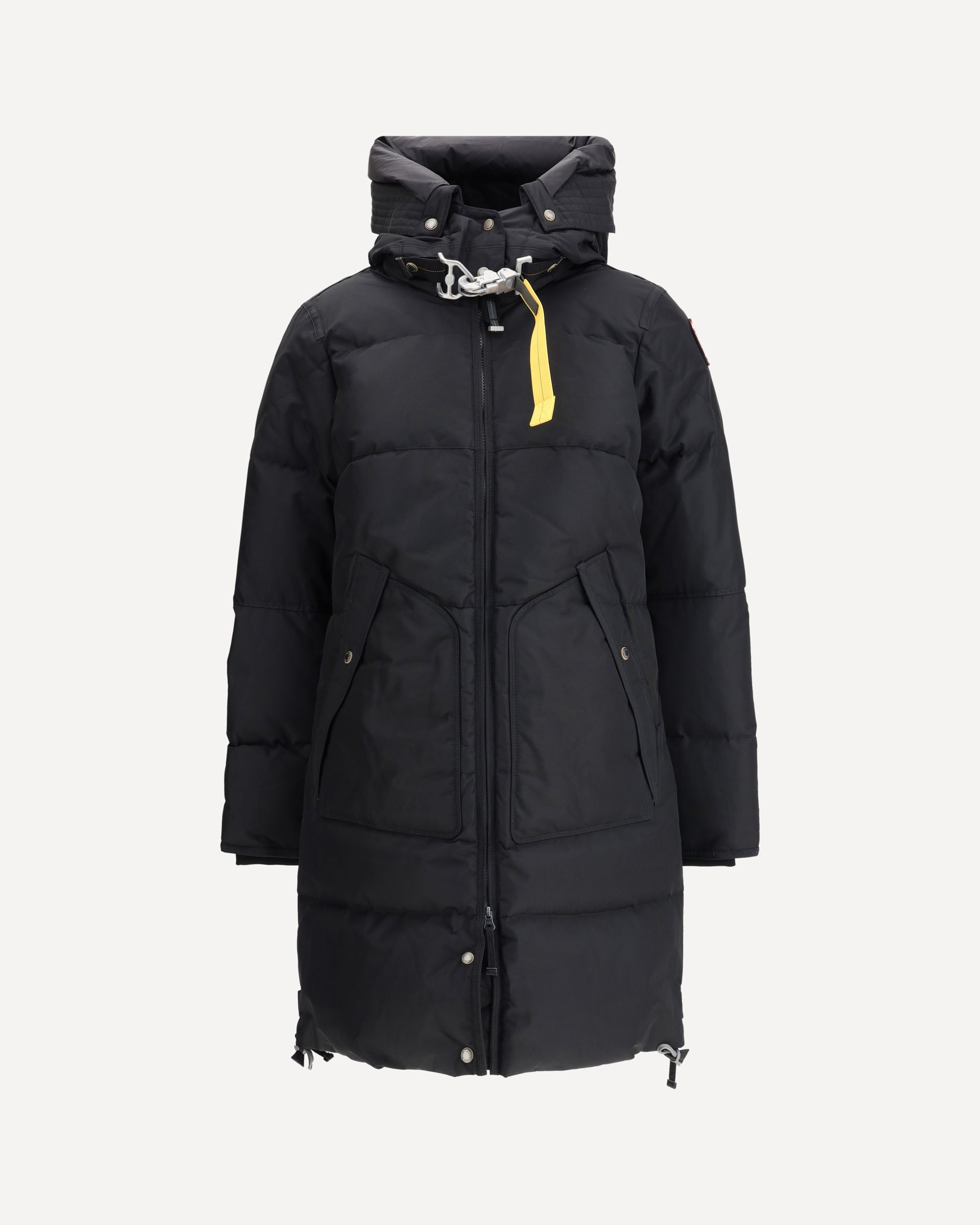 The Long Bear Down Jacket from Parajumpers is a classic and timeless addition to the collection, featuring an adjustable drawstring hood and down filling for warmth and comfort. Made of recycled and laminated nylon oxford, it combines sustainability and durability. A double-slider front zipper closure provides convenience, while two button pockets offer functionality. Elastic rib cuffs and zippered side vents add technical and stylish details. Completing the design are the Parajumpers patch on the sleeve and the iconic removable yellow tape hook at the collar closure, the brand's signature symbol. DETAILS - Sku: 25WMPWJKMA33_0541 - Season: AW25 - Fit: Regular - Composition: OUTER 100% Nylon INNER 100% Duck Down - MADE IN CHINA