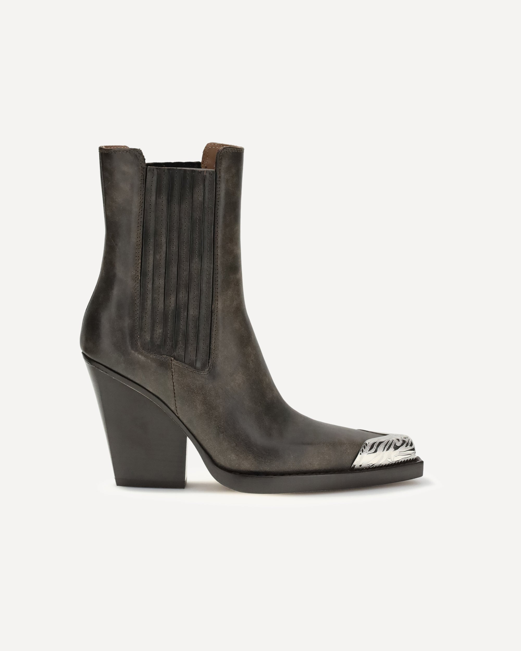 The Dallas texan Ankle Boots by Paris Texas are made of vintage black leather with an embellished metal toe cap, with a bold and gritty character. The block heel provides comfort and momentum, while the tapered silhouette makes them perfect for bold, urban looks. DETAILS - Sku: PX959XVTVT_ASPHALT - Season: AW25 - Composition: GENERAL 100% Leather - MADE IN ITALY