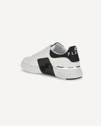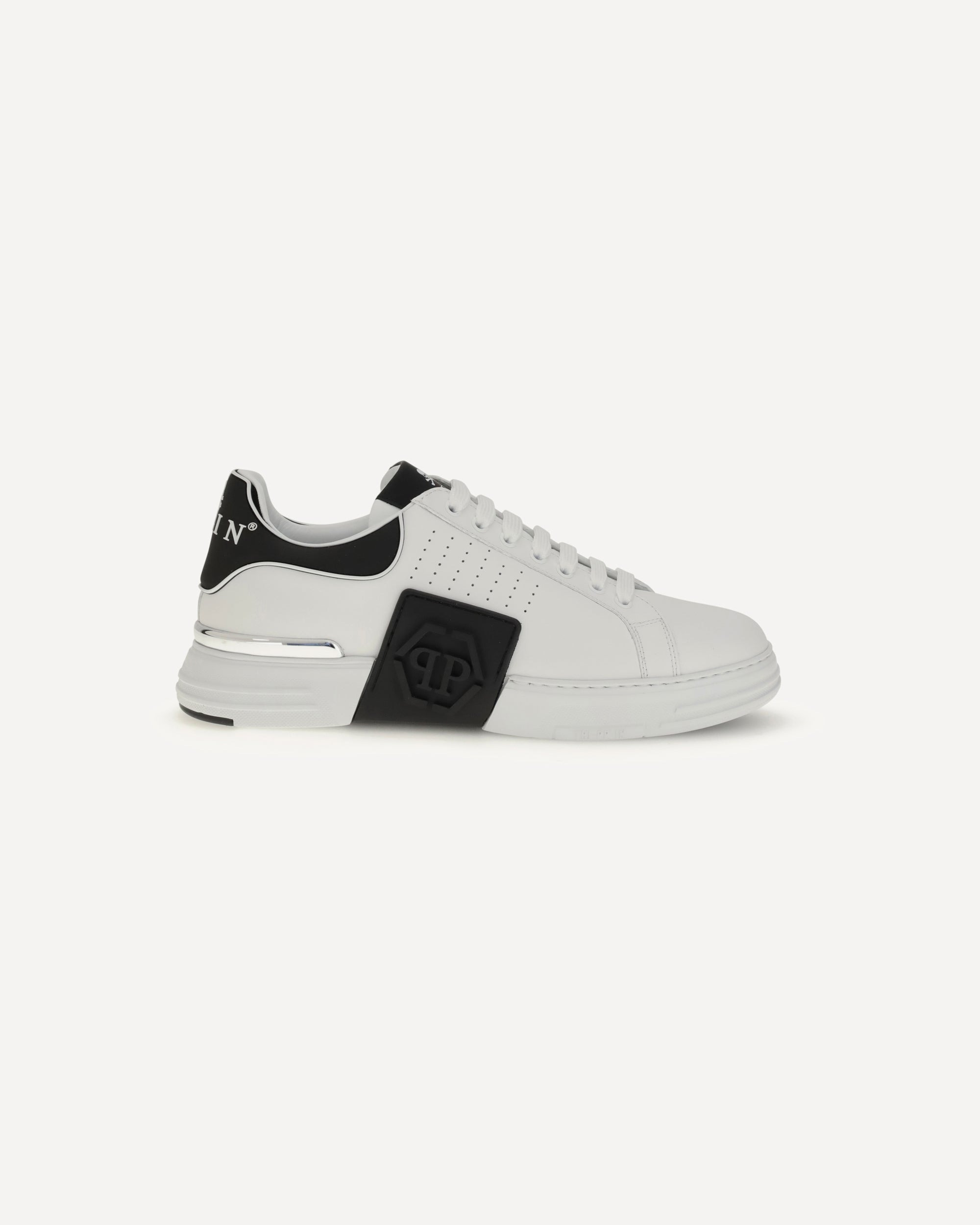 Low Top Hexagon Sneakers by Philipp Plein combine urban style and advanced technology in a bold, modern design. Made of nappa leather, they are embellished with a contrasting logo on the collar and the iconic PP metal hexagon applied to the rubber strap that extends from the sole to the shaft. The nickel-plated metal heel stabilizer adds a distinctive, technical touch. The hi-tech rubber midsole, ergonomic, ultralight and shock-absorbing, ensures superior comfort, while the contoured outsole, inner lining and removable insole complete a shoe designed to deliver uncompromising style and performance. DETAILS - Sku: PAESUSC0775PLE005N_0102 - Season: AW25 - Composition: UPPER 100% Calf Leather Bos Taurus SOLE 100% Rubber - MADE IN ITALY