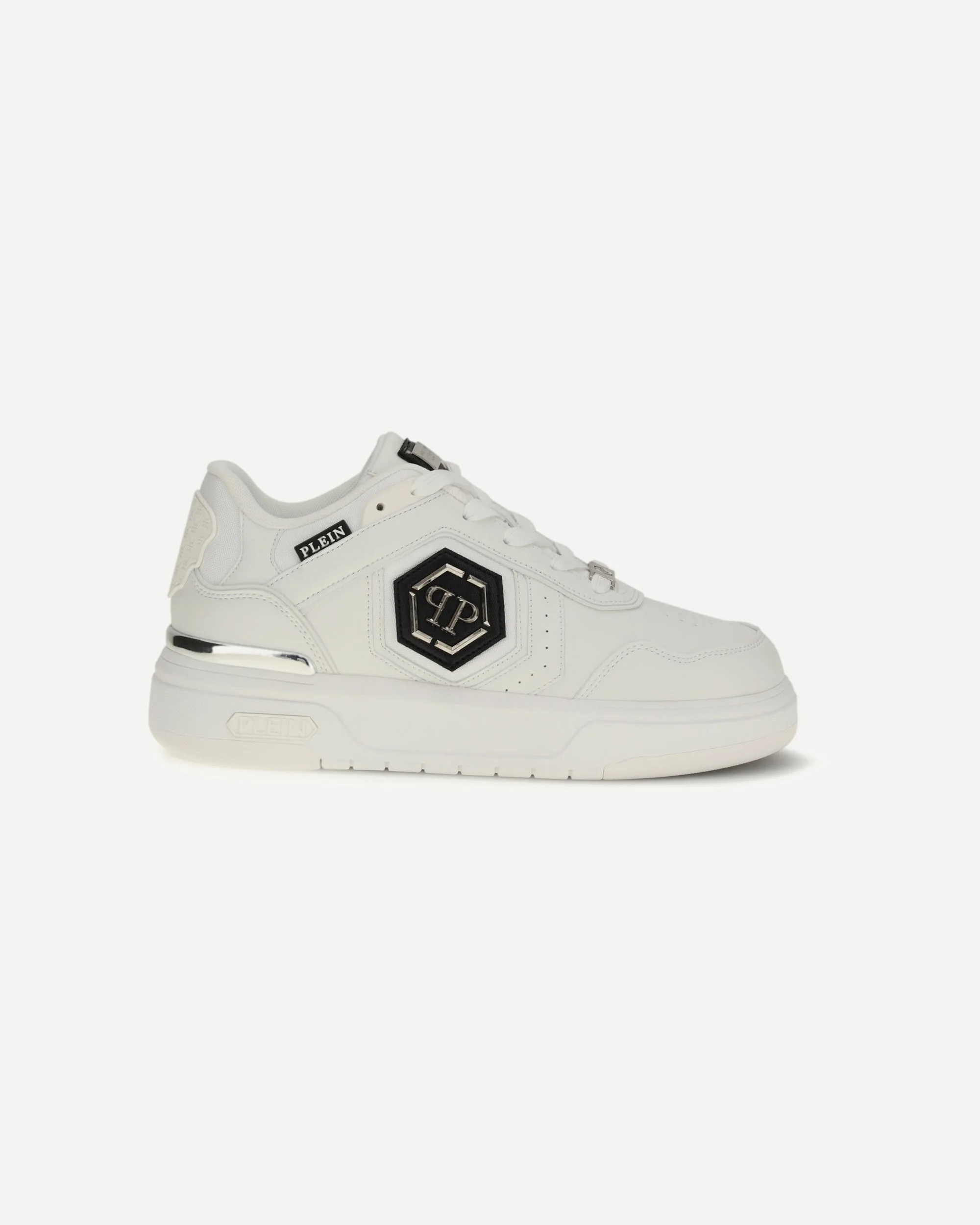 The Sk8r Sneakers by Philippe Plein combine urban style with advanced comfort. The faux leather and canvas upper is embellished with a nickel-plated logo on the outer side and a nickel-plated spoiler between the heel and midsole. The padded and quilted ankle and tongue ensure a comfortable fit, while the perforated details add a touch of originality. The high-tech, ergonomic, and ultra-lightweight rubberized midsole offers excellent cushioning, complemented by a contoured tread that guarantees optimal grip. Perfect for a sporty and elegant look. DETAILS - Sku: SAFSUSC0925PTE003N_01 - Season: SS26 - Composition: UPPER 100% Calf Leather Bos Taurus SOLE 100% Rubber - MADE IN CHINA