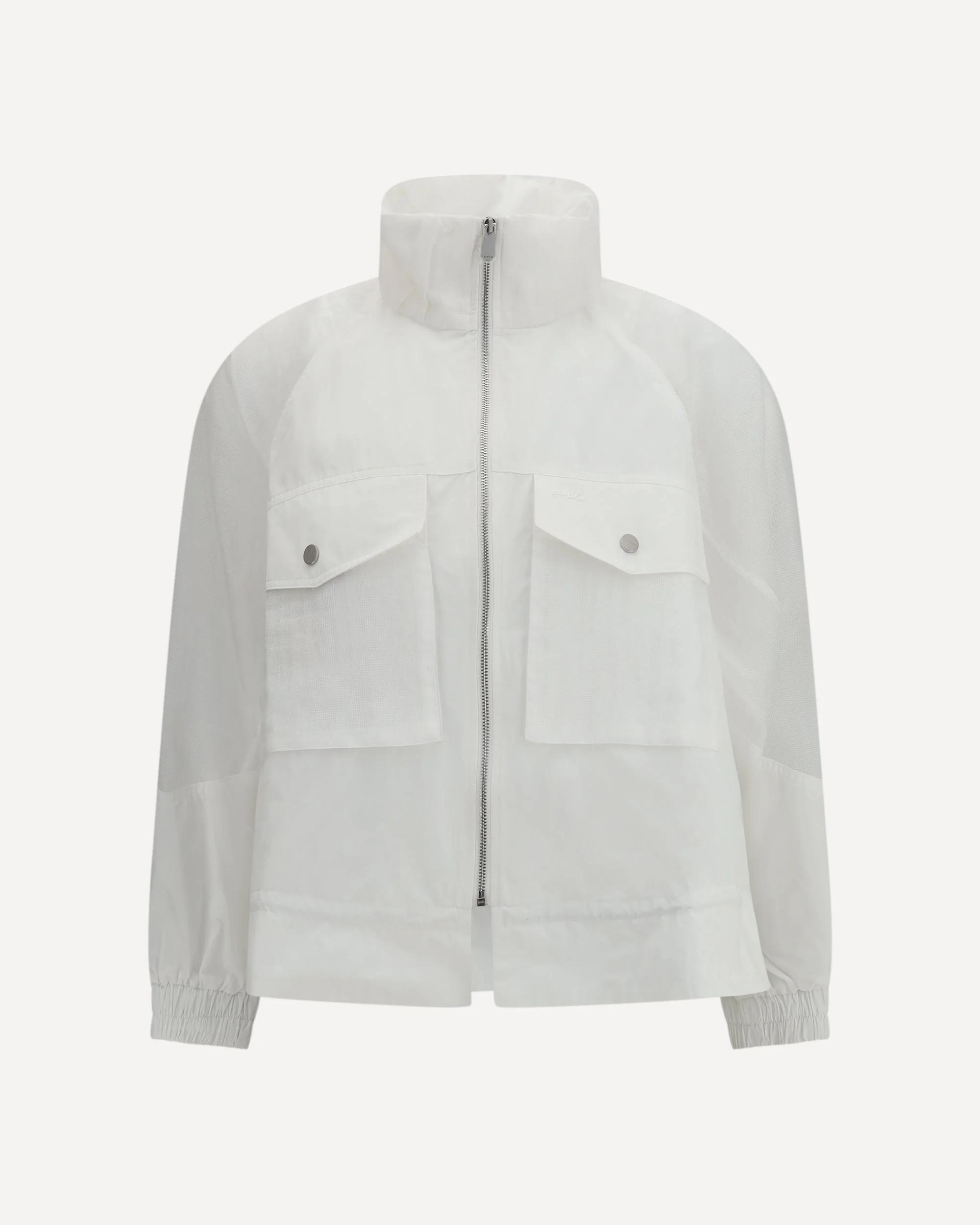 The Beth Jacket with transparent inserts by Pinko is an innovative garment, made from technical fabric reminiscent of taffeta, with transparent ripstop inserts on the sleeves, collar, and pockets, for a perfect blend of durability and lightness. The stand-up collar offers greater protection, while the raglan sleeves and elasticated cuffs ensure comfort and freedom of movement. The practical front bellows pockets with flap and button add functionality, while the zip closure and adjustable internal drawstring at the bottom allow you to customize the fit. DETAILS - Sku: 106592A325_Z04 - Season: SS26 - Fit: Regular - Composition: GENERAL 100% Polyester - MADE IN ITALY