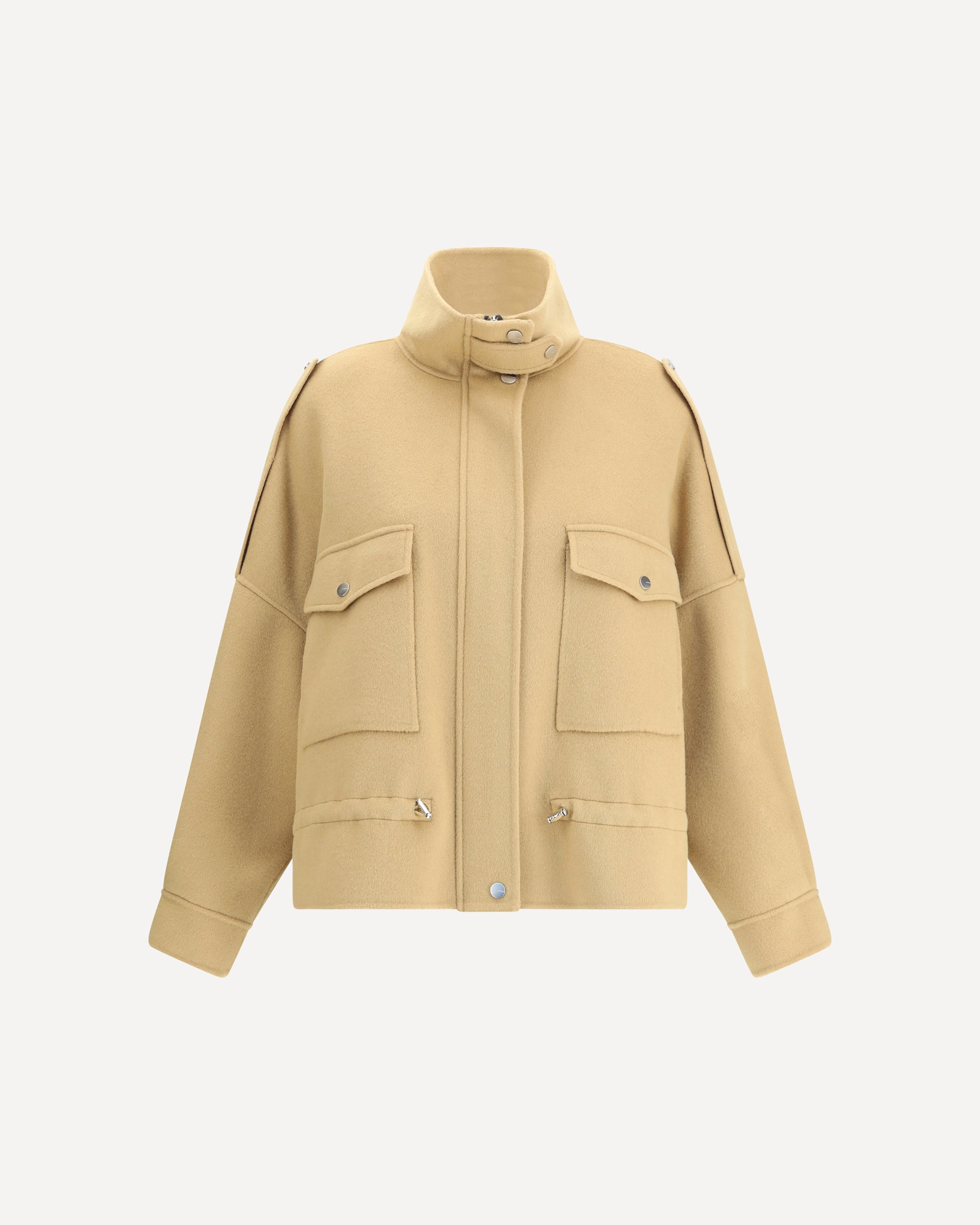 The Pinko Caban is crafted from double wool-blend fabric, featuring a high collar with strap and elongated shoulder tabs. Large flap patch pockets with snap buttons lend a utilitarian flair, while the trekking-inspired drawstring at the waist allows for an adjustable fit. Finished with a concealed snap-button closure and full lining, this short coat balances function and style, making it an ideal companion for the early cold days of the season. DETAILS - Sku: 105341A2XM_CAM - Season: AW25 - Fit: Regular - Composition: GENERAL 82% Wool 18% Nylon - MADE IN CHINA