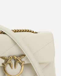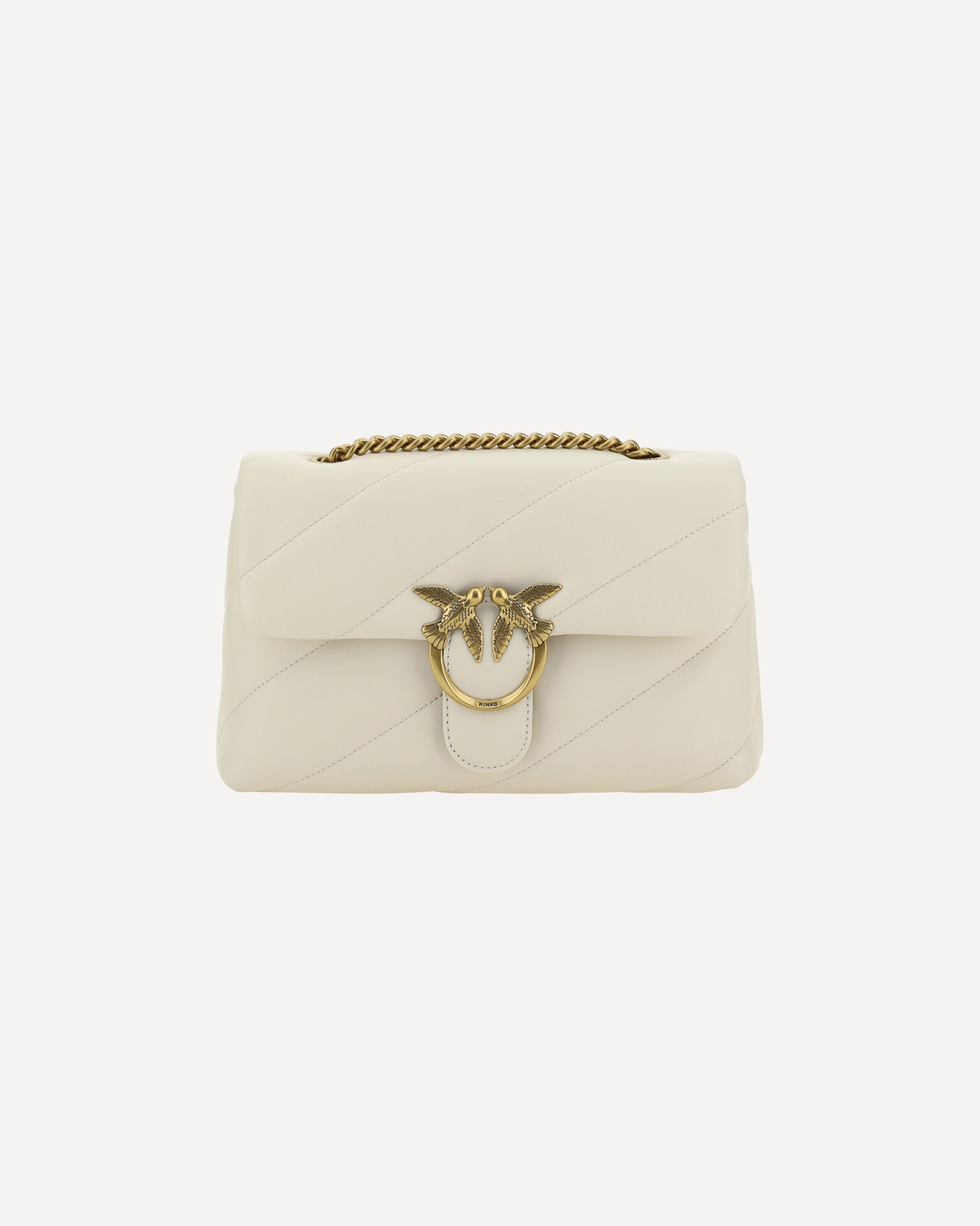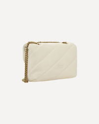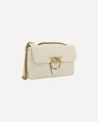 Calfskin Love Classic Shoulder Bag by Pinko, front closure with magnetic button, iconic gold-plated Love Birds logo embossed on the front, quilted and padded design, double internal compartment, sliding chain shoulder strap, iconic brand monogram embroidered tone-on-tone on the back. DETAILS sku 100038A0F2_Z14Q composition: CALF LEATHER BOS TAURUS 100% color group: WHITE gender: WOMAN season: SS25 size chart: UNI category name: SHOULDER BAGS dimensions: 17 x 27 x 10 cm