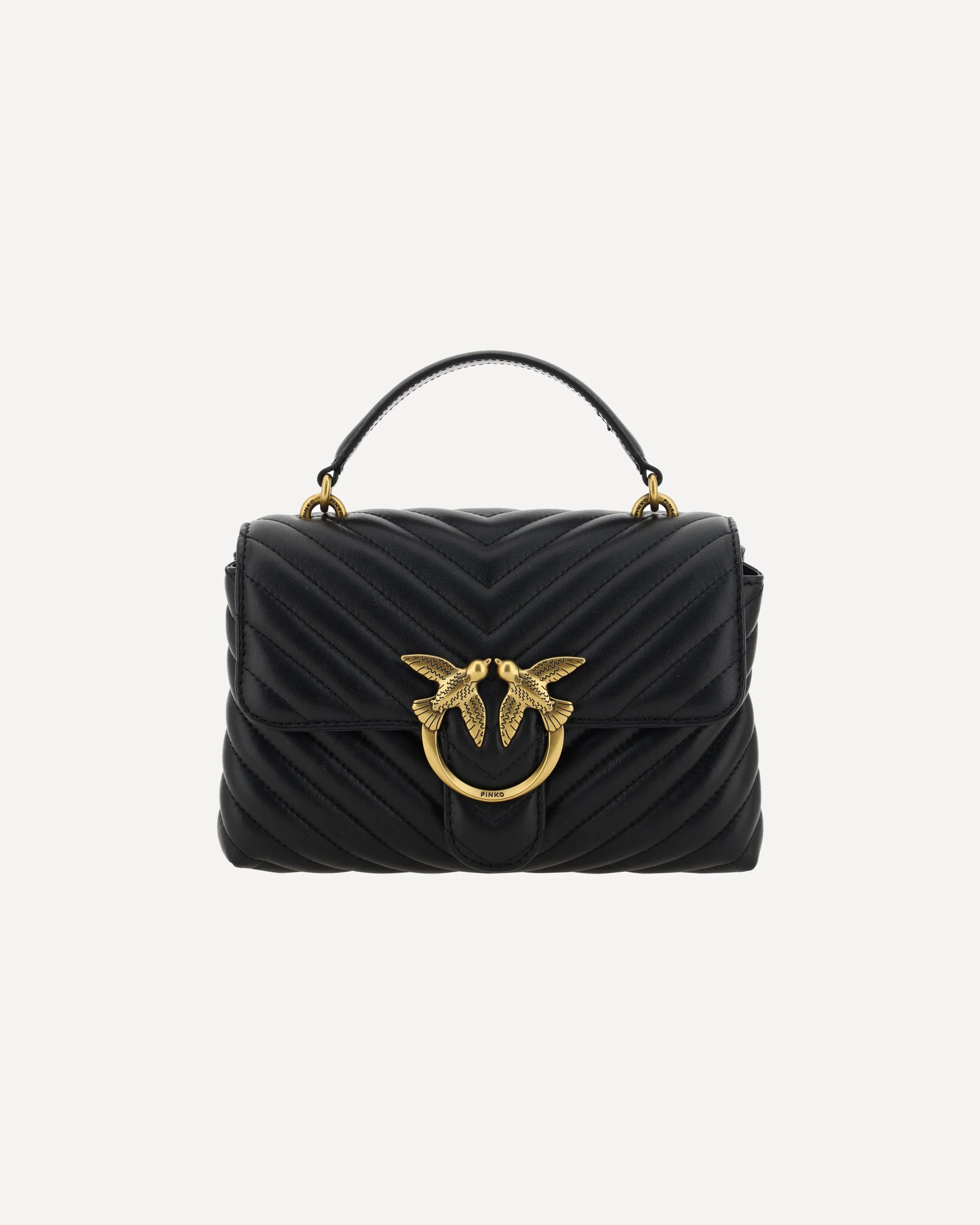Calfskin Love Lady Mini Handbag by Pinko, front magnetic flap closure, iconic gold-plated Love Birds logo embossed on the front, quilted and padded design, double interior compartment, removable chain shoulder strap with smooth leather insert, flat rigid top handle, interior flat pocket with zipper, iconic tone-on-tone embroidered brand monogram on the back. DETAILS - Sku: 100044A0GK_Z99Q - Season: AW25 - Dimension: 26x26x7 - Composition: GENERAL 100% Calf Leather Bos Taurus - MADE IN CHINA