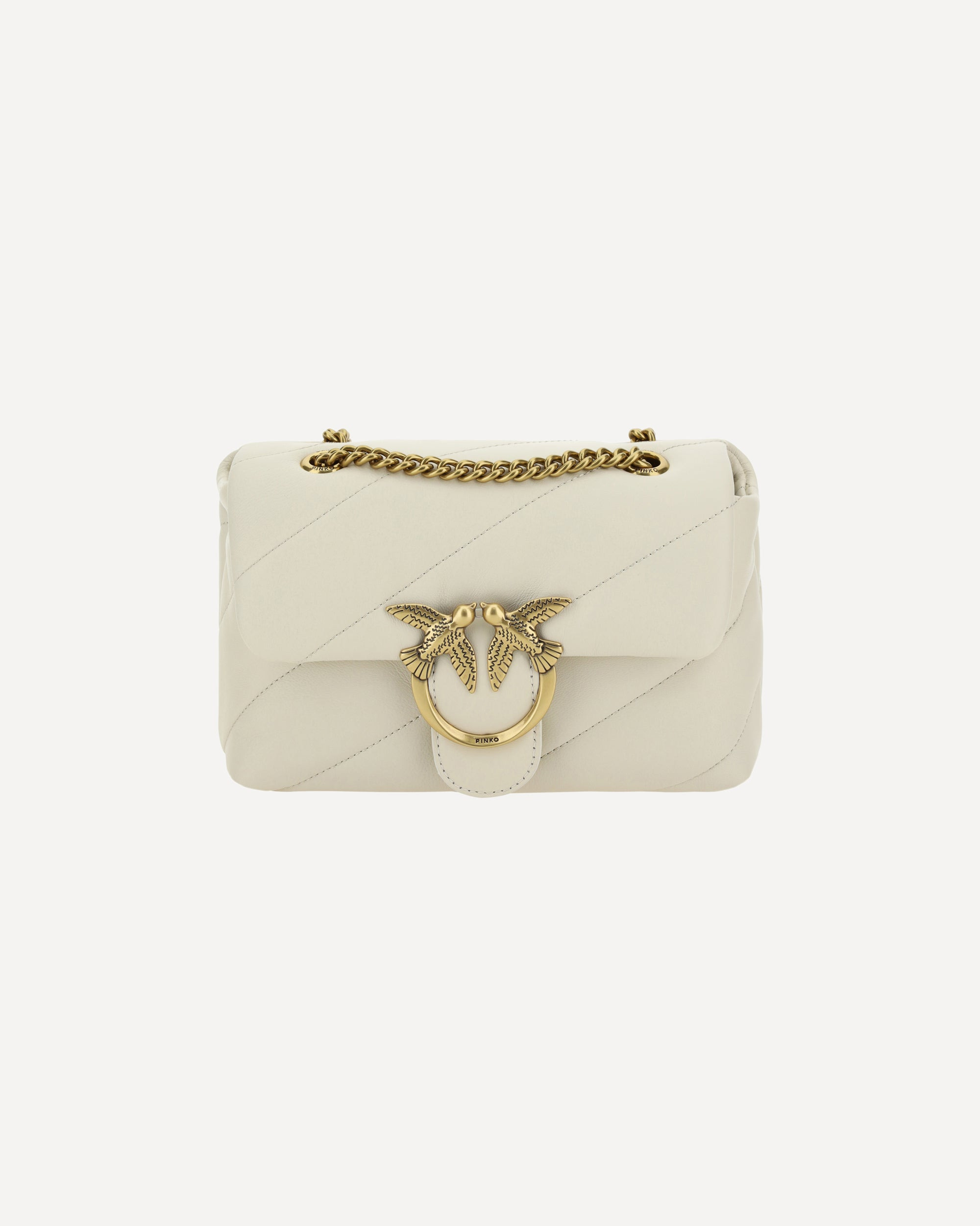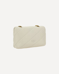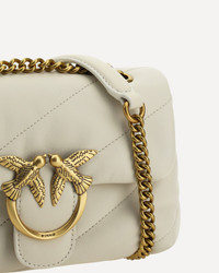 Calfskin Love Mini Puff Shoulder Bag by Pinko, front closure with magnetic button, iconic gold-plated Love Birds logo embossed on the front, quilted and padded design, single internal compartment, sliding chain shoulder strap, iconic brand monogram embroidered tone-on-tone on the back. DETAILS sku 100039A0F2_Z14Q color group: WHITE gender: WOMAN season: SS25 size chart: UNI category name: SHOULDER BAGS dimensions: 14 x 22 x 9 cm