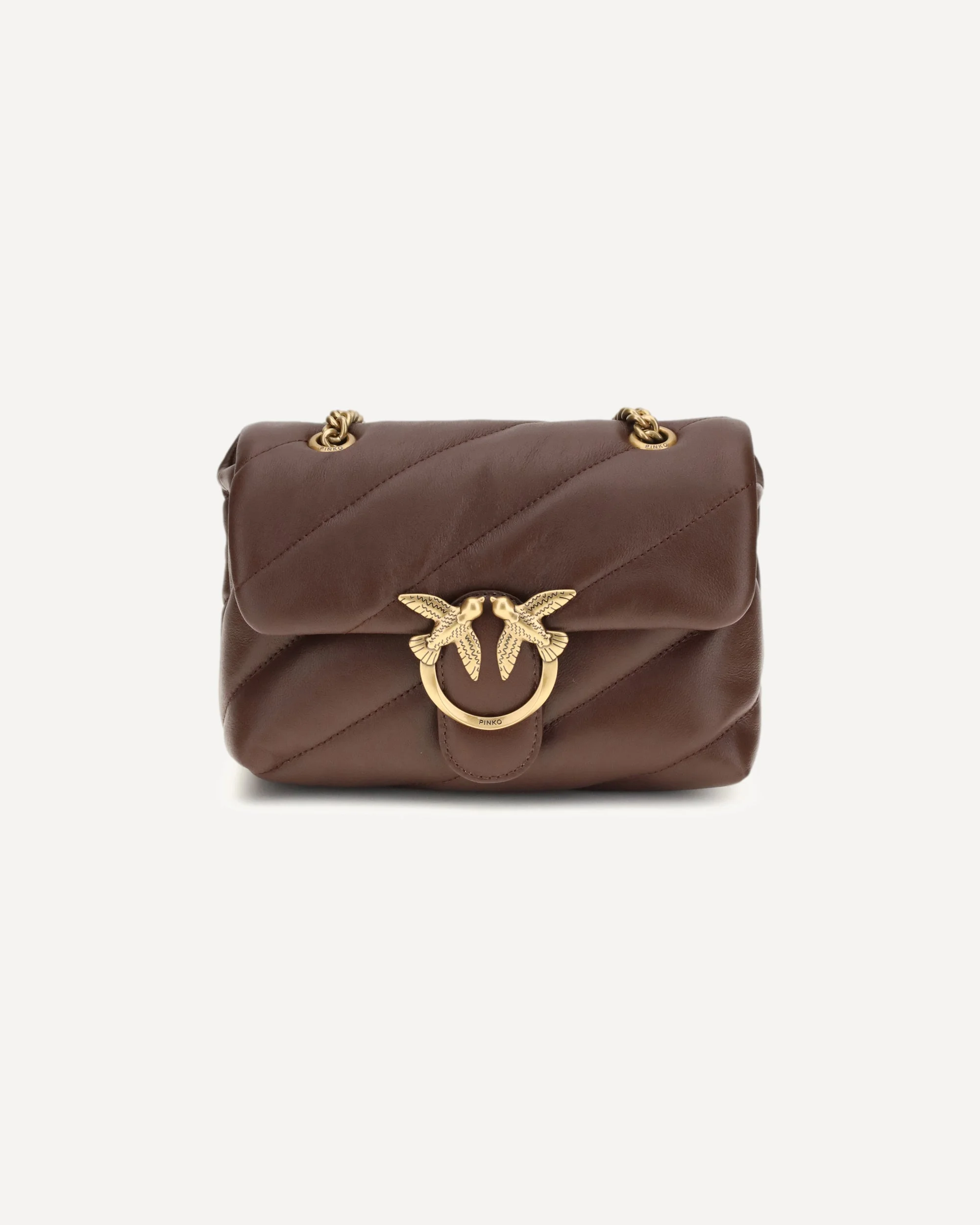 The Love Mini Puff leather Shoulder Bag by Pinko is a stylish and fashionable accessory. The front closure with magnetic button ensures practicality and security, while the iconic Love Birds logo, gold-plated and embossed on the front, adds a touch of luxury. The quilted and padded design gives the bag a rich and sophisticated texture. Inside, there is single interior compartment for excellent organization. The sliding chain strap offers versatility, allowing it to be worn on the shoulder or crossbody. On the back, the brand's iconic tone-on-tone embroidered monogram adds a discreet and refined detail. DETAILS - Sku: 100039A0F2_R49Q - Season: SS26 - Dimension: 22x22x9 - Composition: GENERAL 100% Calf Leather Bos Taurus - MADE IN CHINA