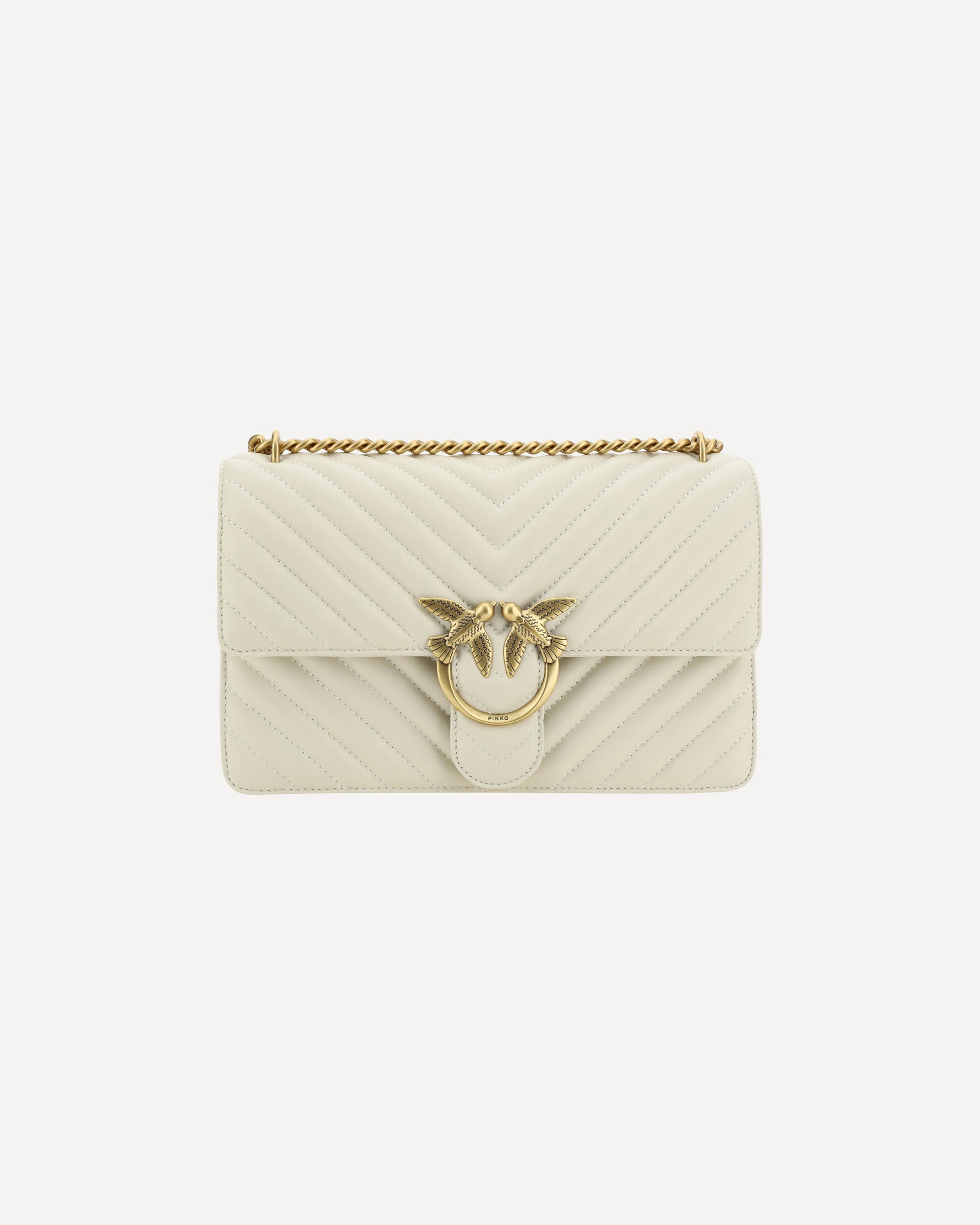 Calfskin Love One Classic Shoulder Bag by Pinko, front magnetic button closure, iconic gold-plated Love Birds logo embossed on front, quilted and padded design, double interior compartment, sliding chain shoulder strap, iconic tone-on-tone embroidered brand monogram on back, adjustable and removable flat leather shoulder strap. DETAILS sku 100941A0GK_Z14Q composition: CALF LEATHER BOS TAURUS 100% color group: WHITE gender: WOMAN season: SS25 size chart: UNI category name: SHOULDER BAGS dimensions: 16 x 27 x 8 cm