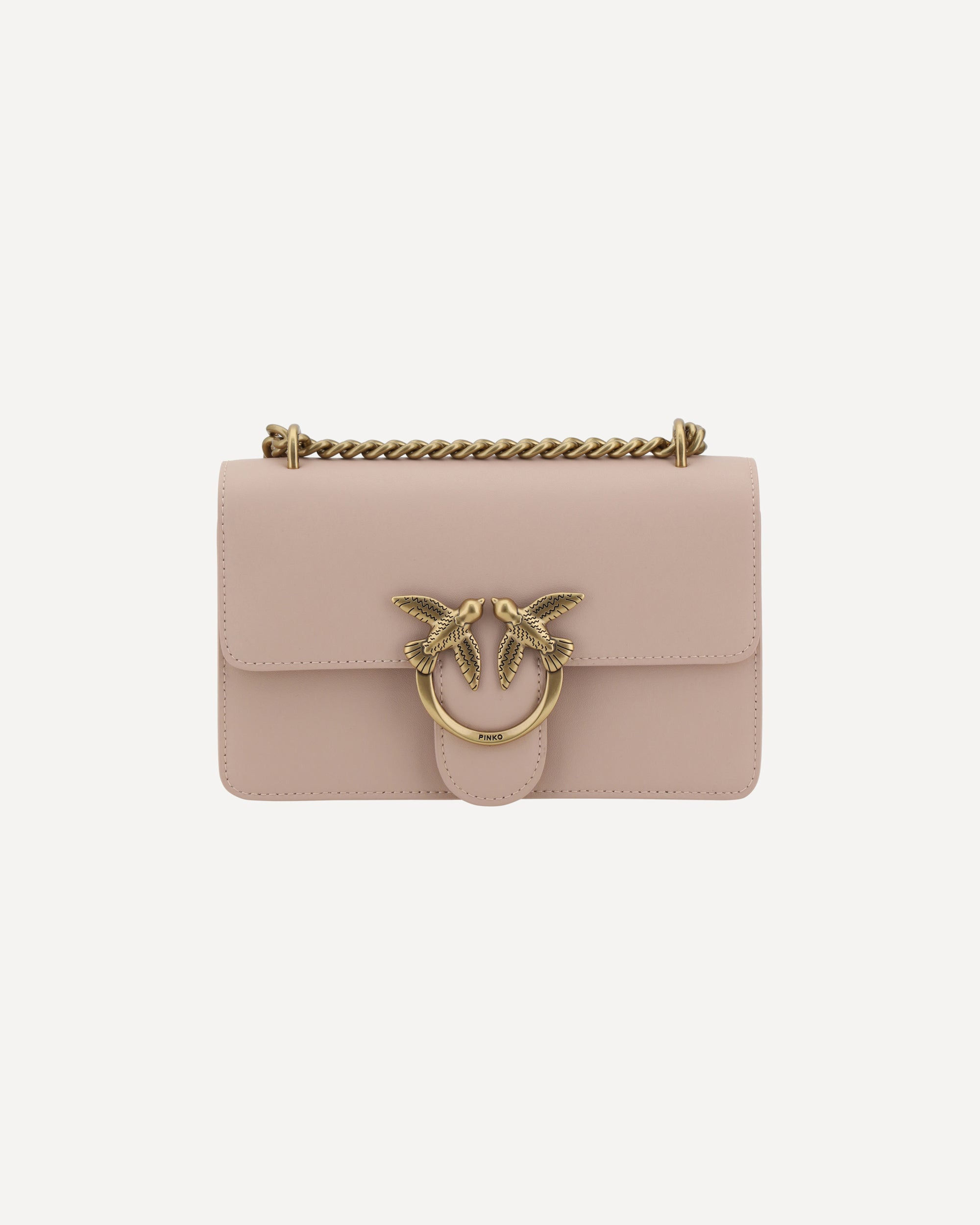 Calfskin Love One Mini Shoulder Bag by Pinko, featuring front flap closure with magnetic button, iconic gold-plated Love Birds logo embossed on front, dual interior compartment, sliding chain strap, iconic tone-on-tone embroidered brand monogram on back, adjustable and removable flat leather shoulder strap. DETAILS sku 100074A0F1_O81Q composition: CALF LEATHER BOS TAURUS 100% color group: PINK gender: WOMAN season: SS25 size chart: UNI category name: SHOULDER BAGS dimensions: 13 x 21 x 6 cm