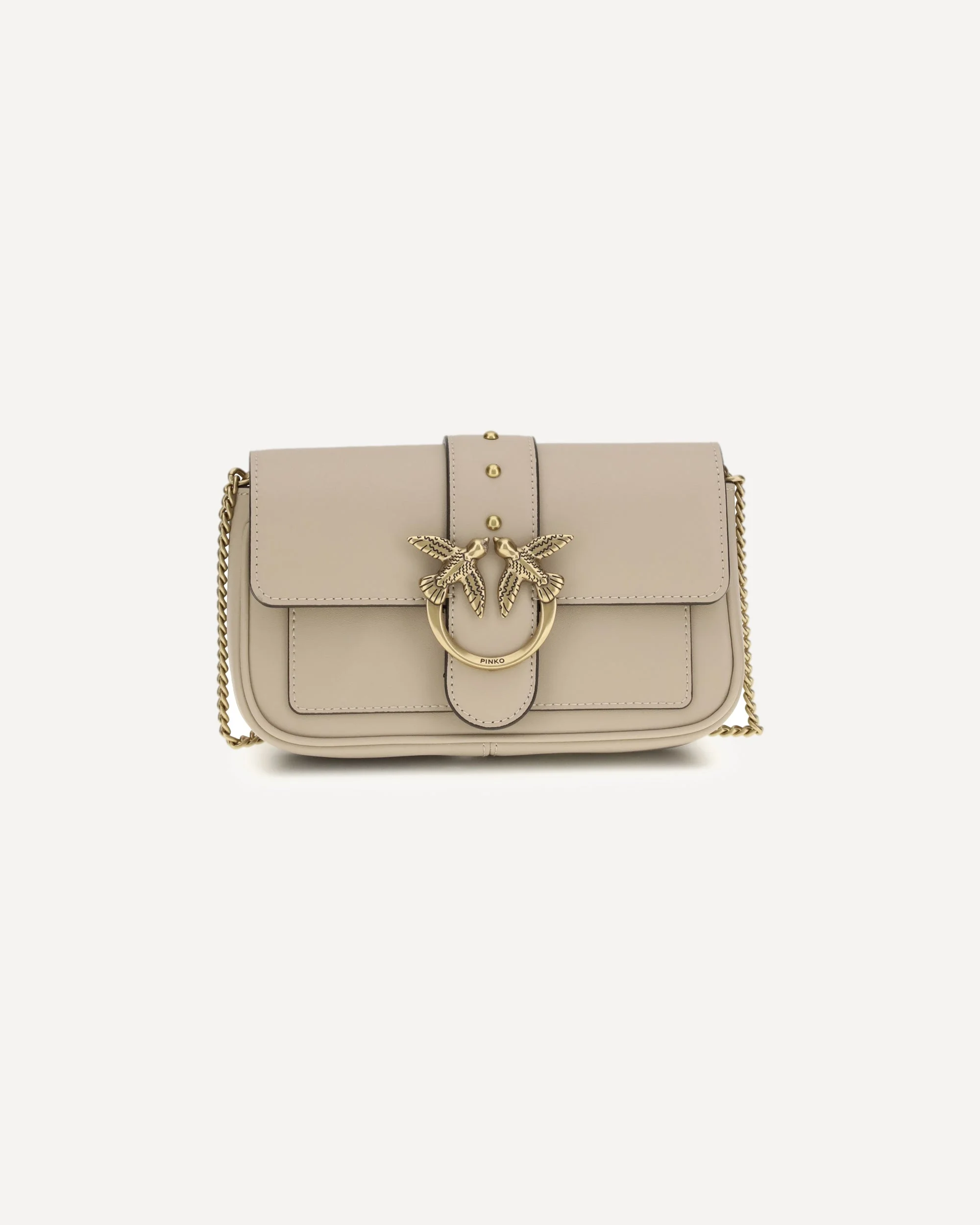The Calfskin Love One Shoulder Bag by Pinko, interlocking front fastening, adjustable and sliding chain shoulder strap, iconic Love Birds buckle embossed on the front, double internal compartment, internal zipped pocket, flat card pocket, iconic tone-on-tone embroidered brand monogram on the back. DETAILS - Sku: 100061A0F1_C50Q - Season: SS26 - Dimension: 19x19x3 - Composition: GENERAL 100% Calf Leather Bos Taurus - MADE IN CHINA