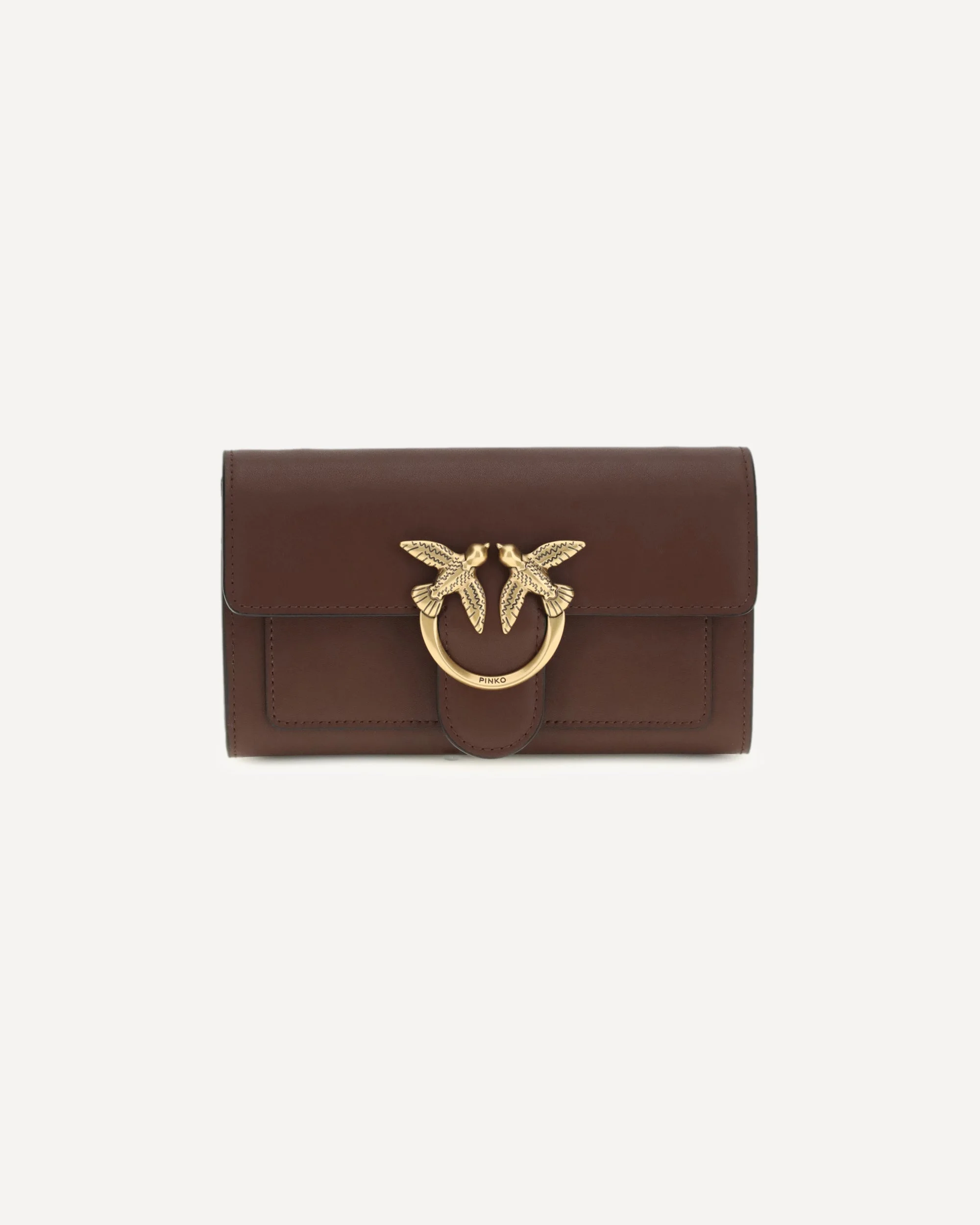 Calfskin One Love Wallet by Pinko, front magnetic button closure, adjustable and sliding chain shoulder strap, iconic Love Birds buckle embossed on the front, internal card slots, banknote compartment, zippered coin compartment for closure, internal zippered pocket, flat card pocket, iconic brand monogram embroidered tone on tone on the back. DETAILS - Sku: 100062A0F1_R49Q - Season: SS26 - Dimension: 19x19x2 - Composition: GENERAL 100% Calf Leather Bos Taurus - MADE IN CHINA