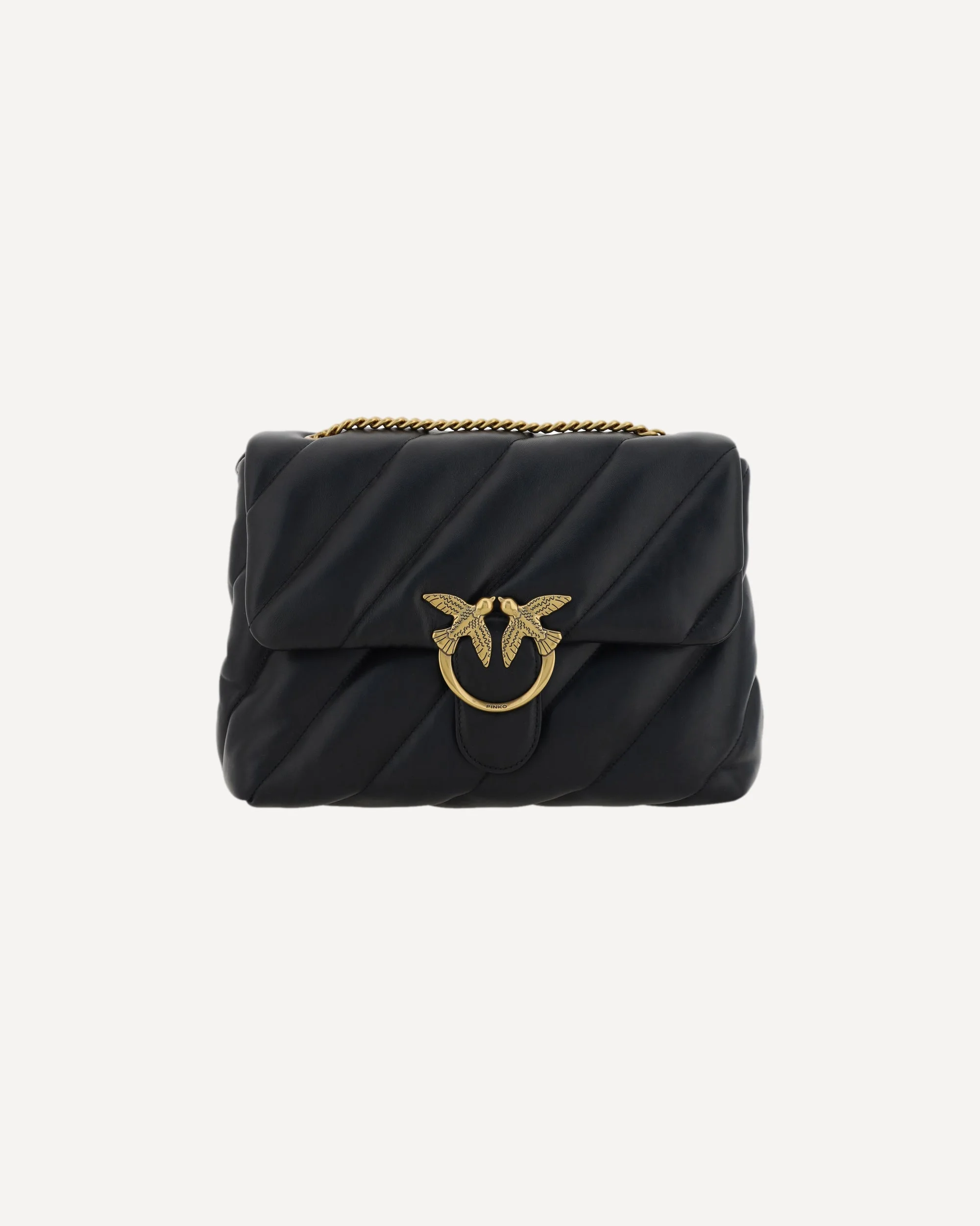 Calfskin Love Puff Shoulder Bag by Pinko, magnetic button front fastening, an iconic gold-plated Love Birds logo embossed on the front, a quilted and padded design, a triple interior compartment, a sliding chain shoulder strap, and an iconic tone-on-tone embroidered brand monogram on the back. DETAILS - Sku: 100037A0F2_Z99Q - Season: SS26 - Dimension: 32x32x13 - Composition: GENERAL 100% Calf Leather Bos Taurus - MADE IN CHINA