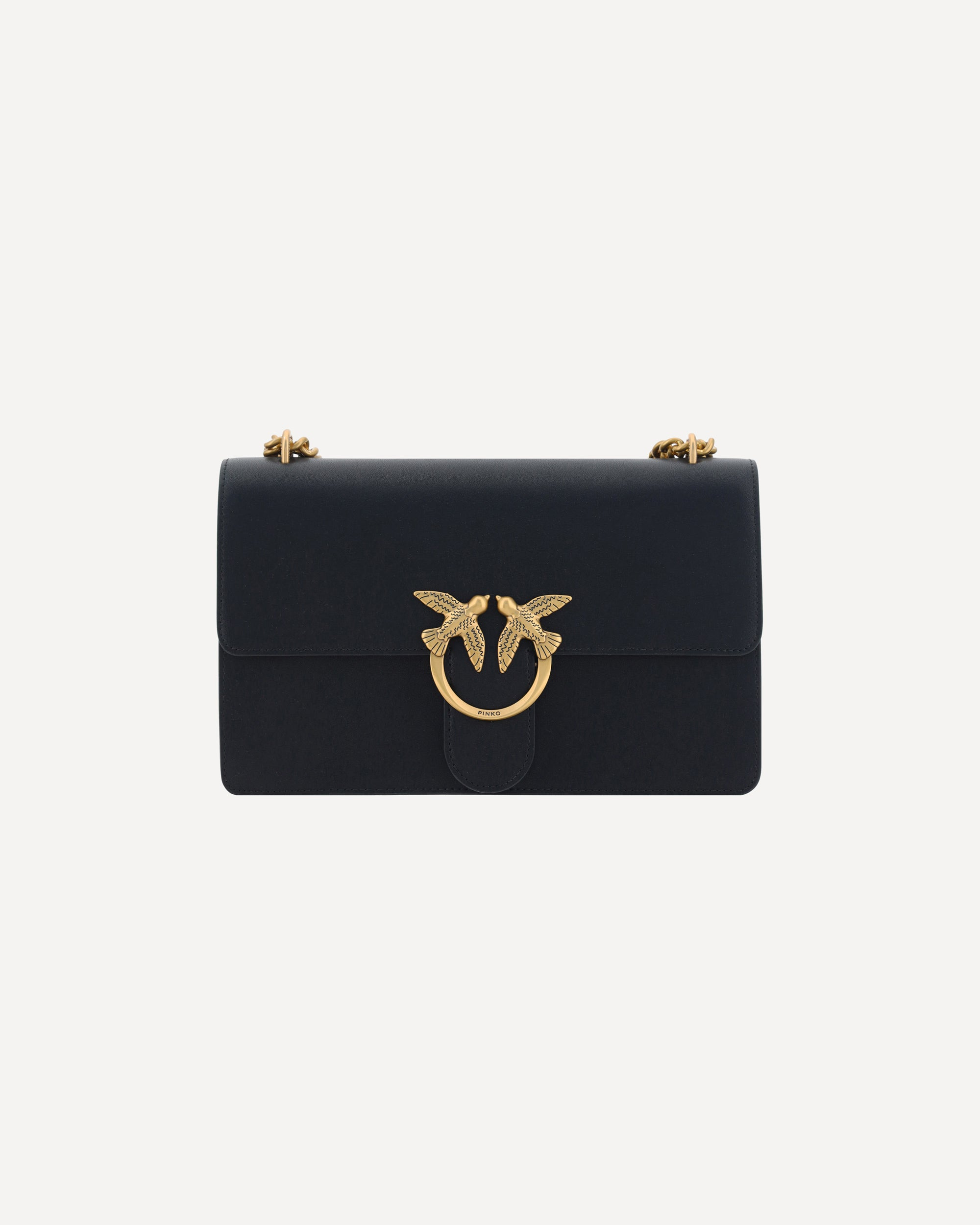 Leather Love Shoulder Bag by Pinko featuring front closure via magnetic flap, adjustable and sliding chain shoulder strap, iconic Love Birds buckle embossed on front, dual interior compartment, interior zipper pocket, flat card pocket, iconic tone-on-tone embroidered brand monogram on back. DETAILS sku 100941A0F1_Z99Q composition: CALF LEATHER BOS TAURUS 100% color group: BLACK gender: WOMAN season: AW24 size chart: UNI category name: SHOULDER BAGS dimensions: 16 x 27 x 7 cm