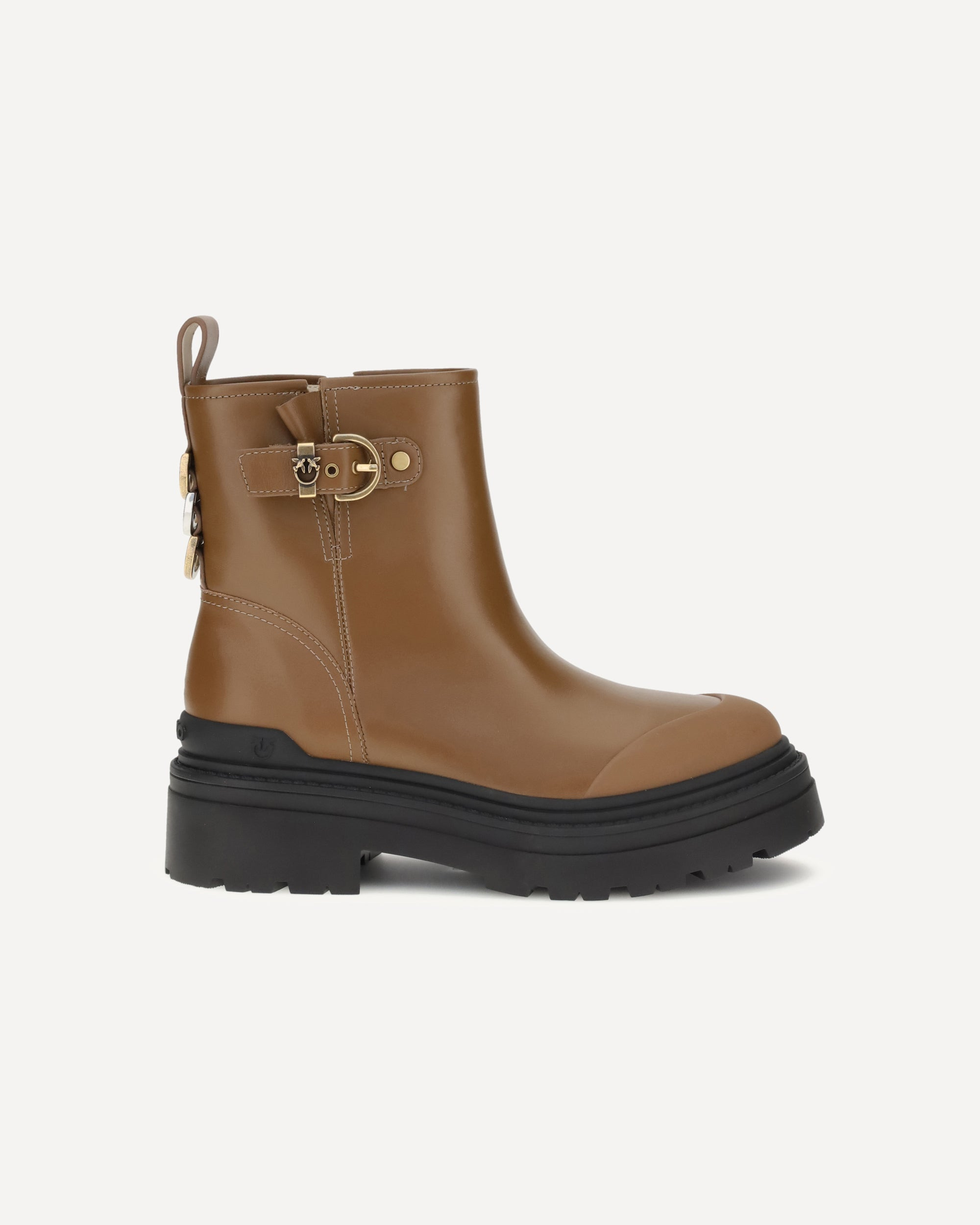 Pinko's Mia Ankle Boots are made of leather and feature a round toe. They feature a buckle and side zipper closure, an elegant metal Love Birds detail on the side and decorative applique rings on the back. The rubber sole ensures comfort and grip. DETAILS - Sku: SD0409P001GU8_SIGARO - Season: AW25 - Composition: UPPER 100% Calf Leather Bos Taurus SOLE 100% Rubber - MADE IN CHINA