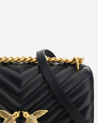 The Mini Love leather Shoulder Bag by Pinko is a perfect mix of elegance and functionality. The front closure with magnetic flap ensures safety and practicality, while the iconic gold-plated Love Birds logo embossed on the front adds a touch of distinctive luxury. The quilted and padded design is not only refined, but also gives a feeling of softness and comfort. The double internal compartment offers enough space to keep everything in order, while the sliding chain shoulder strap allows you to adjust it to your preferred height, making it perfect for any occasion. The internal slip pocket and the tone-on-tone embroidered brand monogram on the back add exclusive details that make this bag a must-have. DETAILS - Sku: 100074A0GK_Z99Q - Season: AW25 - Dimension: 21x21x7 - Composition: GENERAL 100% Calf Leather Bos Taurus - MADE IN CHINA