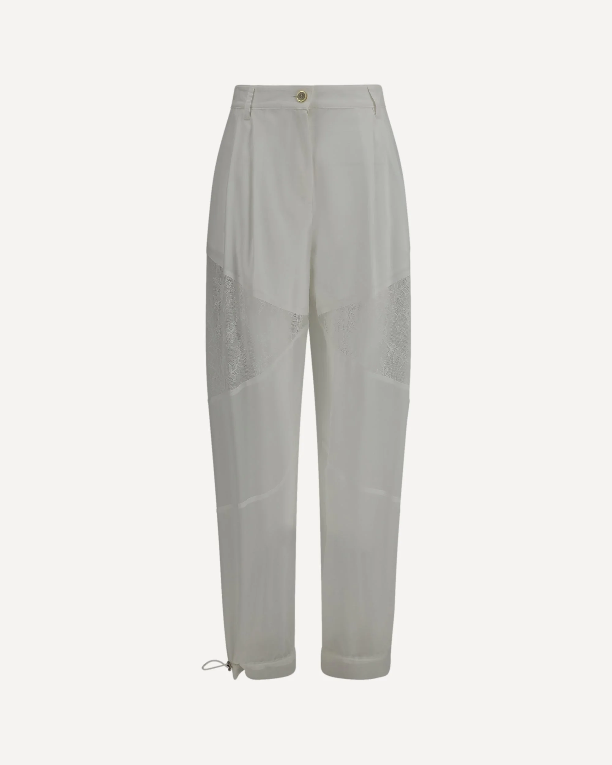 The Nacy Pants with lace inserts by PINKO embody a refined balance between tailored structure and contemporary femininity. Designed with front darts that define the silhouette, the style stands out for its lace inserts, adding a sophisticated touch while keeping the overall look clean. The concealed button and zip closure ensures a streamlined finish, while the front pockets and embroidered logo on the back introduce subtle brand identity. Belt loops and a drawstring at the hem allow for adjustable styling, and the elasticated hem enhances comfort and versatility, making the trousers suitable for polished everyday outfits as well as more elevated looks. DETAILS - Sku: 106275A336_Z05 - Season: SS26 - Fit: Regular - Composition: GENERAL 100% Polyester - MADE IN CHINA