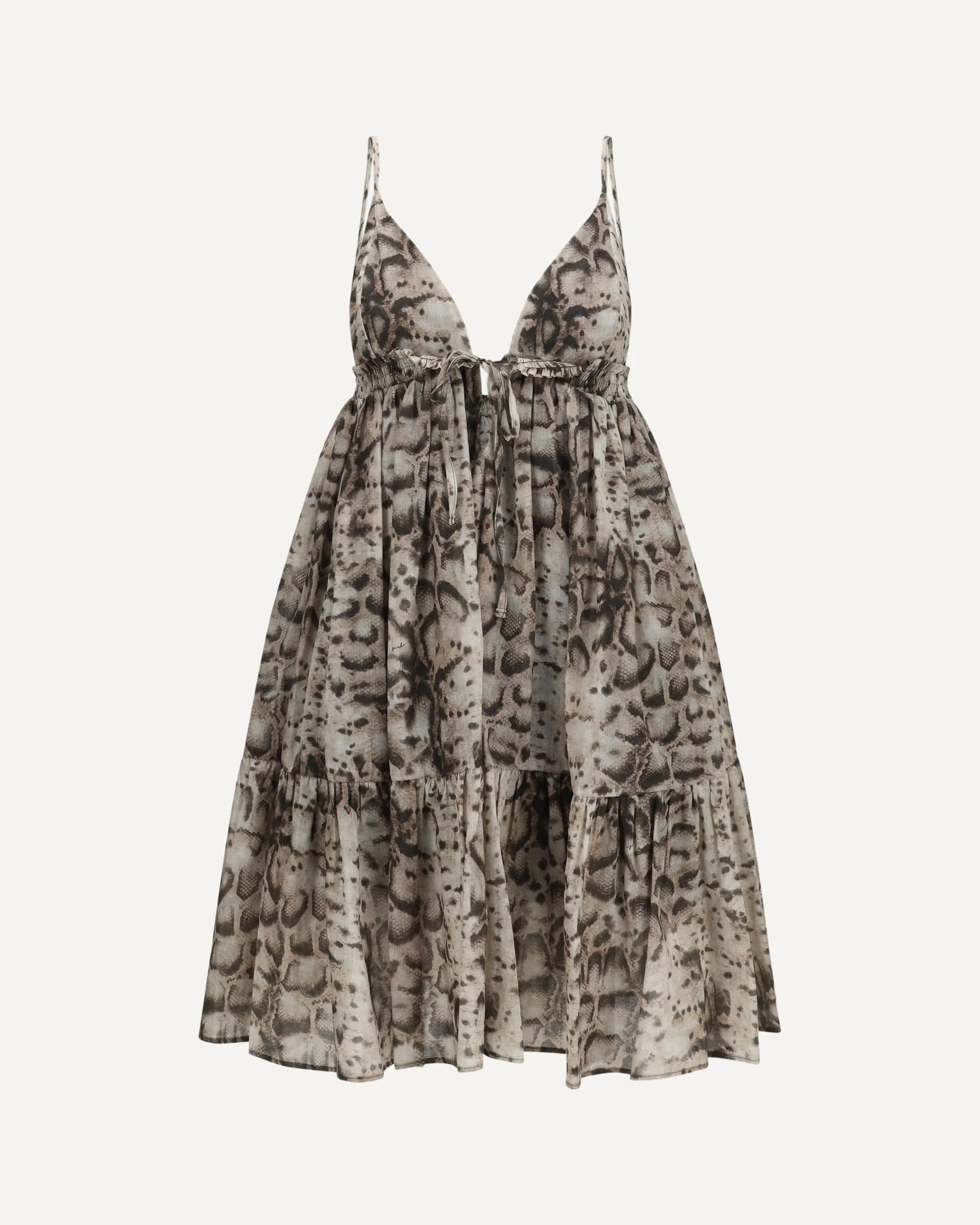 The short snake-print Dress by Pinko stands out for its soft and feminine silhouette, crafted from cotton muslin with a cotton lining to ensure comfort and freshness. The Pinko dress features a sleeveless design with thin adjustable straps and a deep V-neckline that enhance the upper part of the garment. The elastic insert with a front metal button and small ruching under the bust, from which soft pleats fall, define the structure and movement of the dress. The ruffled hem adds extra volume and lightness. The all-over snake print completes the Pinko dress with a bold and contemporary style. DETAILS - Sku: 106917A3AP_CZ9 - Season: SS26 - Fit: Regular - Composition: GENERAL 100% Cotton - MADE IN CHINA