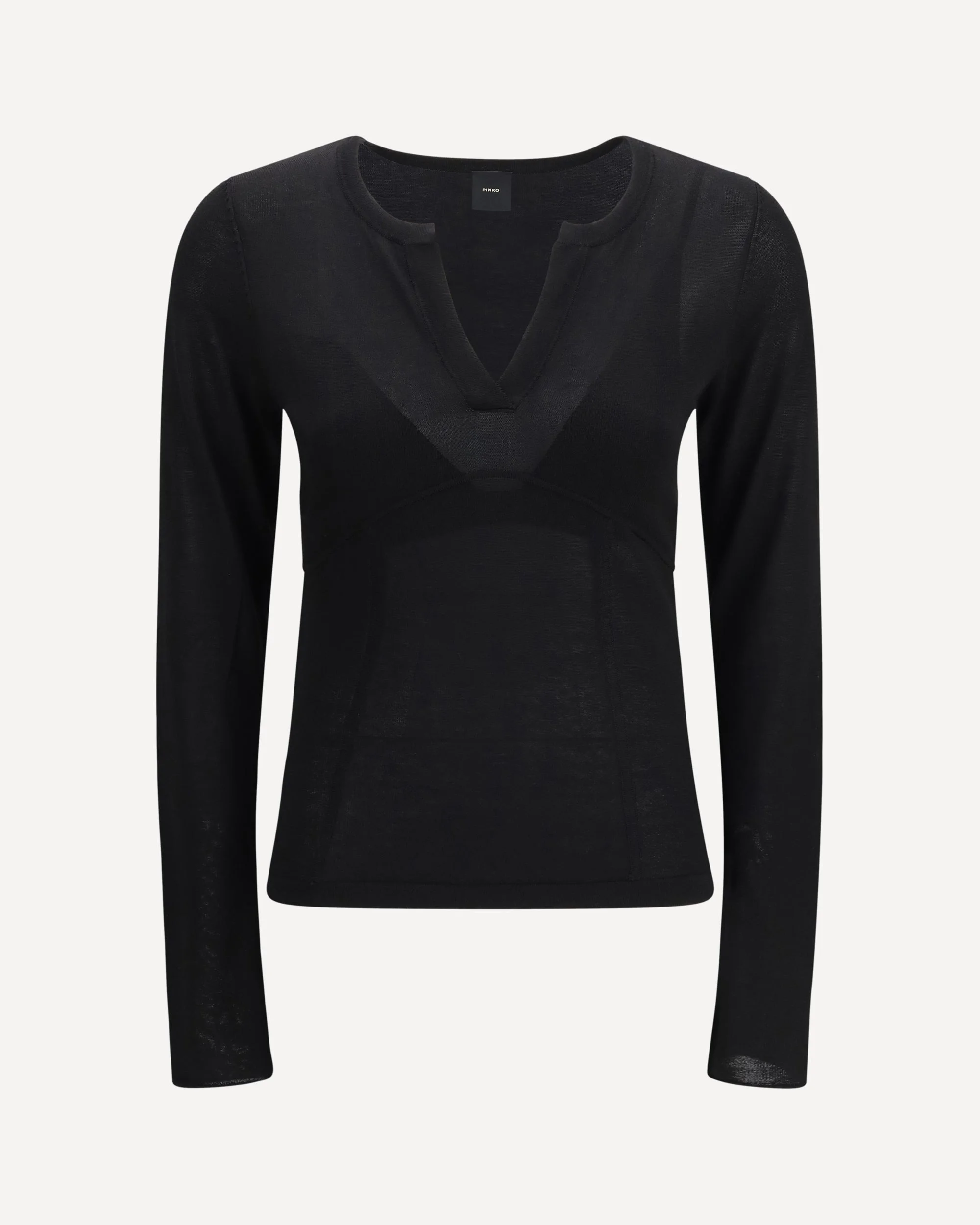 The Sweater long-sleeve with V-open neckline by Pinko expresses essential elegance with a contemporary edge. Crafted from lightweight cotton and viscose yarn, it features a V opening and bustier-inspired cut details that enhance the silhouette with confident femininity. The jacquard logo lettering label at the back signs the design with a distinctive touch, making it a versatile wardrobe staple. DETAILS - Sku: 106332A349_Z99 - Season: SS26 - Fit: Regular - Composition: GENERAL 57% Viscose 43% Cotton - MADE IN CHINA