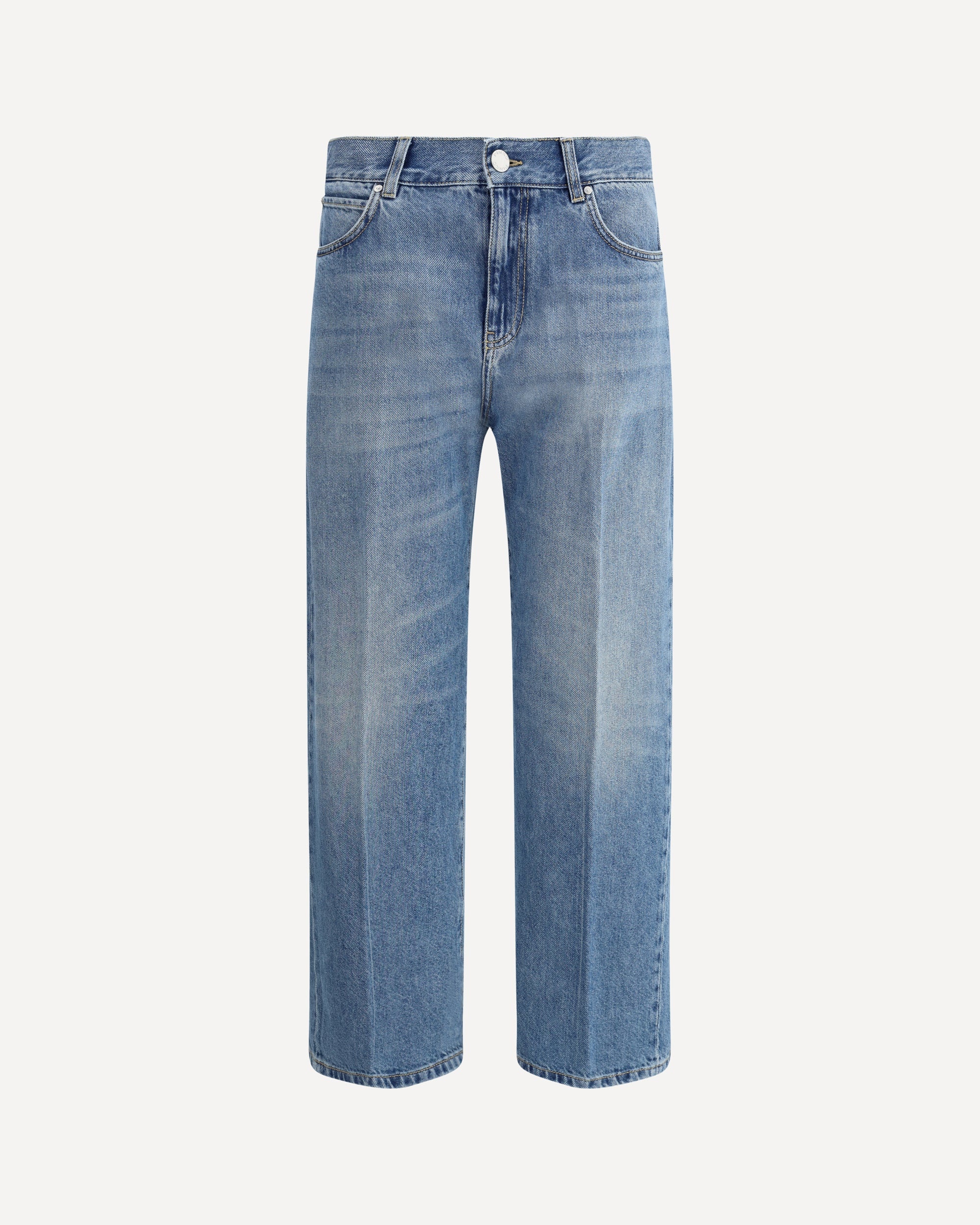 Pinko's Lovely cotton Jeans feature a wide-leg, five-pocket design with a mid-rise waist and front button-and-zip closure. Belt loops at the waistband allow the fit to be adjusted. They also feature slits on the inner side panels, an original detail that adds a touch of style. The iconic leather patch with the brand's signature pressure print on the back gives the garment a distinctive and refined touch. DETAILS - Sku: 104600A2DY_PJU - Season: SS25 - Fit: Regular - Composition: GENERAL 100% Cotton - MADE IN ALBANIA