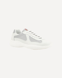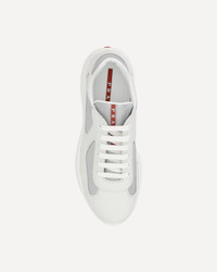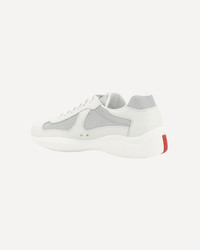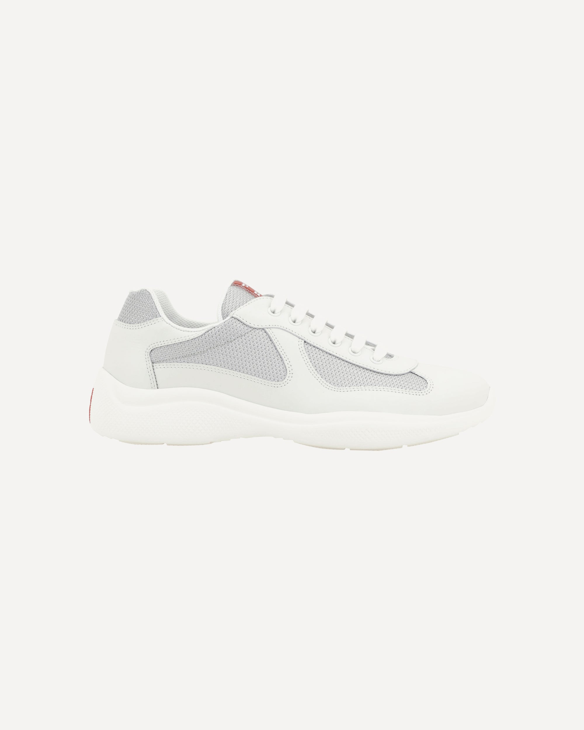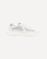 Prada's America's Sneakers are a modern and stylish interpretation of the classic sneaker, ideal for those seeking comfort without sacrificing style. Featuring a lace-up closure, they offer an adjustable and secure fit. The slightly elongated toe adds a distinctive touch, while the textured sole ensures a stable and comfortable walk. The leather and fabric panel design creates a dynamic and contemporary visual effect, while the brand's iconic applique logo on the tongue adds an understated luxury detail. DETAILS sku 4E3400FG0006GW_F0J36 composition: CALF LEATHER BOS TAURUS 50% RUBBER 100% POLYAMIDE 50% color group: WHITE gender: MAN season: SS25 size chart: SHOES UK category name: LACE UP
