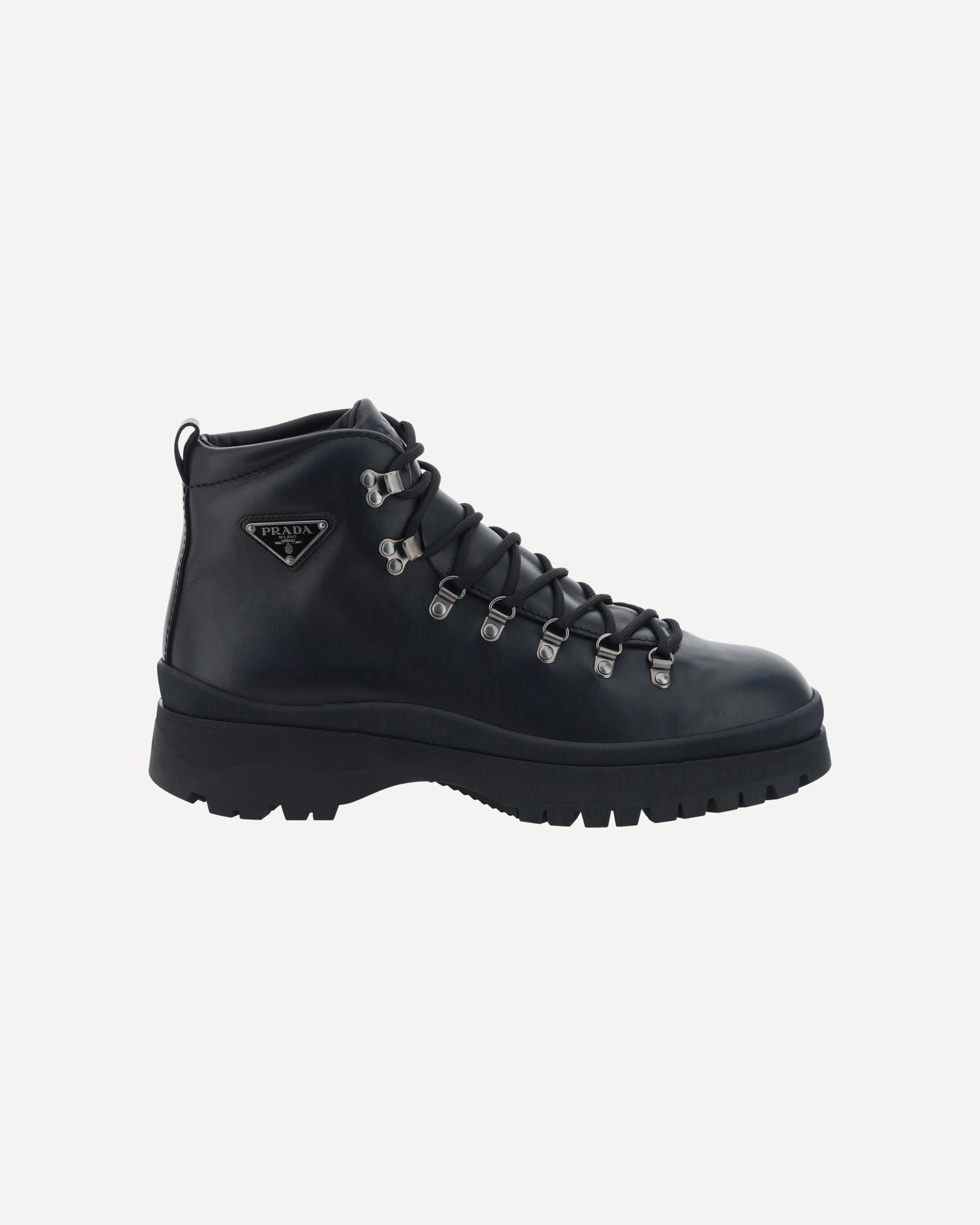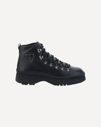 Leather Ankle Boots by Prada, lace-up front closure, pull tab for easy on and off fit, non-slip rubber lug sole, iconic triangular embossed applique plaque on ankle, round toe. DETAILS sku 2TE201FG000070_F0002 composition: RUBBER 100% CALF LEATHER BOS TAURUS 100% color group: BLACK gender: MAN season: AW24 size chart: SHOES UK category name: BOOTS