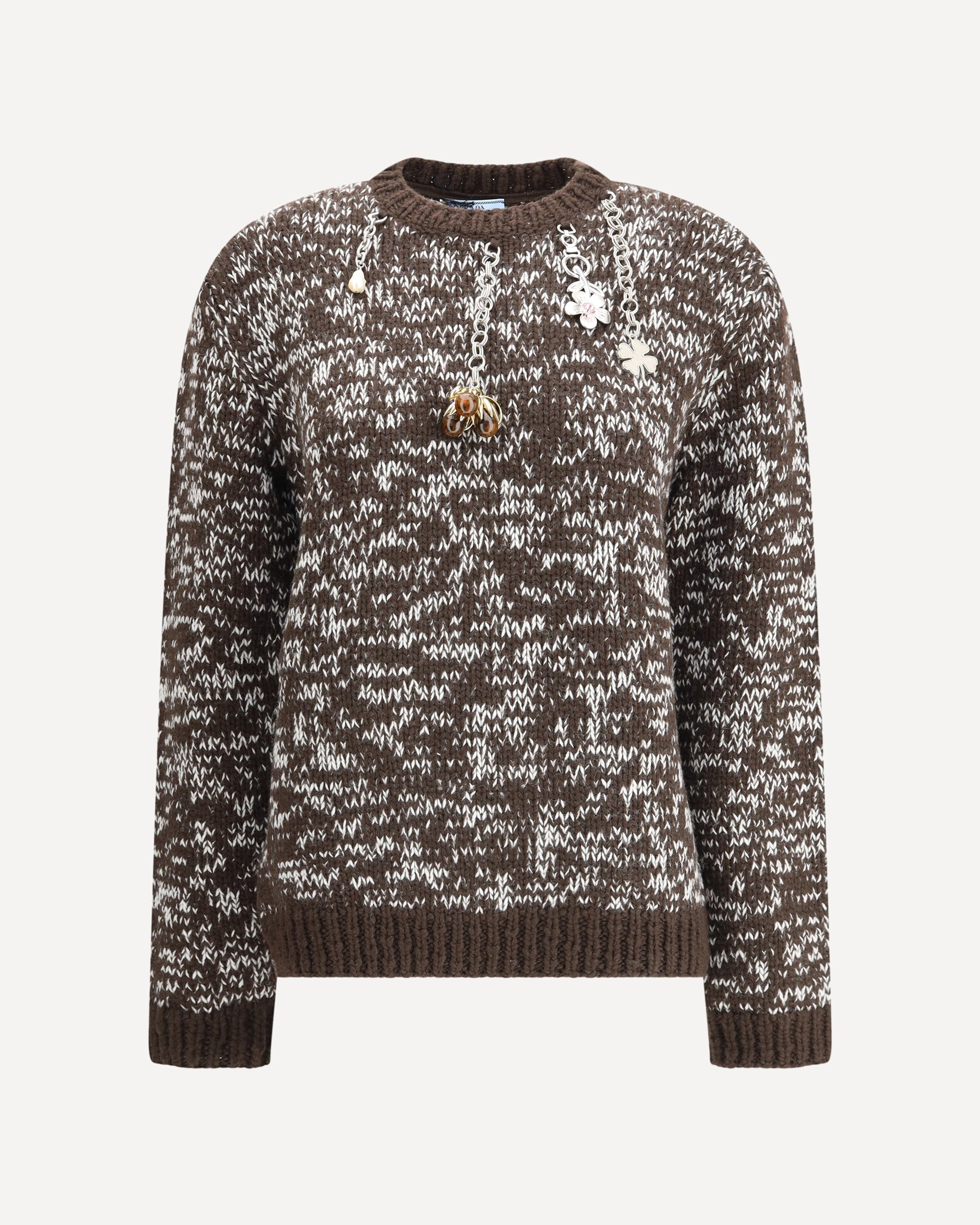 The charm-embellishment Sweater by Prada blends knitwear tradition with a contemporary, distinctive touch. Featuring a speckled pattern, this piece is designed with a classic crew neck, long sleeves, and ribbed trims. Decorative charm embellishments elevate the design, adding a refined and unexpected detail that embodies the brand’s sophisticated elegance. DETAILS - Sku: P24U2FSOOO18HH_F056L - Season: AW25 - Fit: Regular - Composition: GENERAL 100% Fleece Wool - MADE IN ITALY