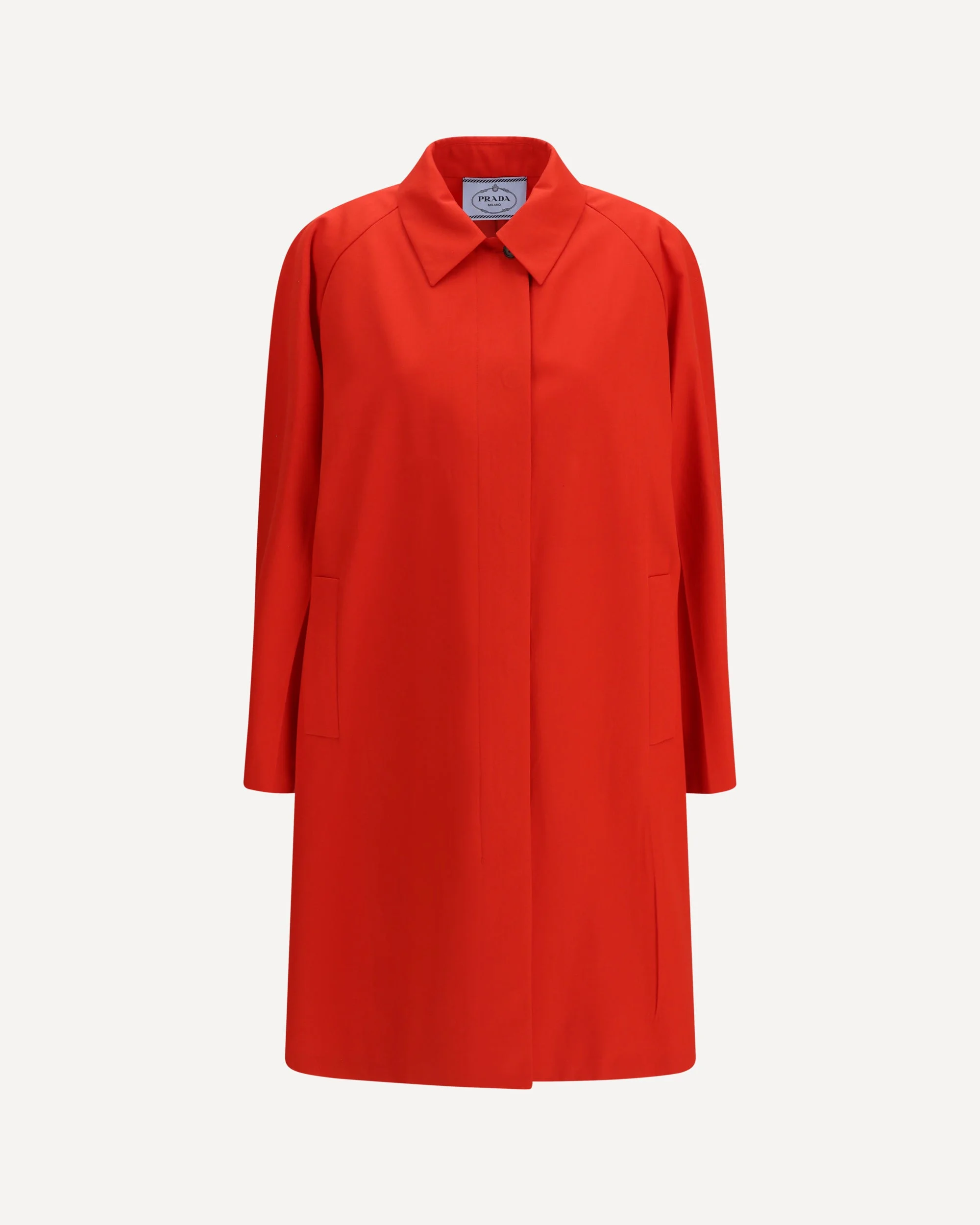 The Cotton Gabardine Coat with classic collar and concealed front button fastening by Prada embodies essential elegance through clean lines and tailored construction. Raglan sleeves create a soft, contemporary silhouette, while integrated side welt pockets maintain a sleek and refined finish. The slightly flared hem adds movement and lightness to the design. Crafted from a cotton blend, this Coat by Prada combines comfort and sophistication in a timeless and versatile piece. DETAILS - Sku: P603TGSOOO184A_F0011 - Season: SS26 - Fit: Regular - Composition: GENERAL 100% Polyester - MADE IN ITALY