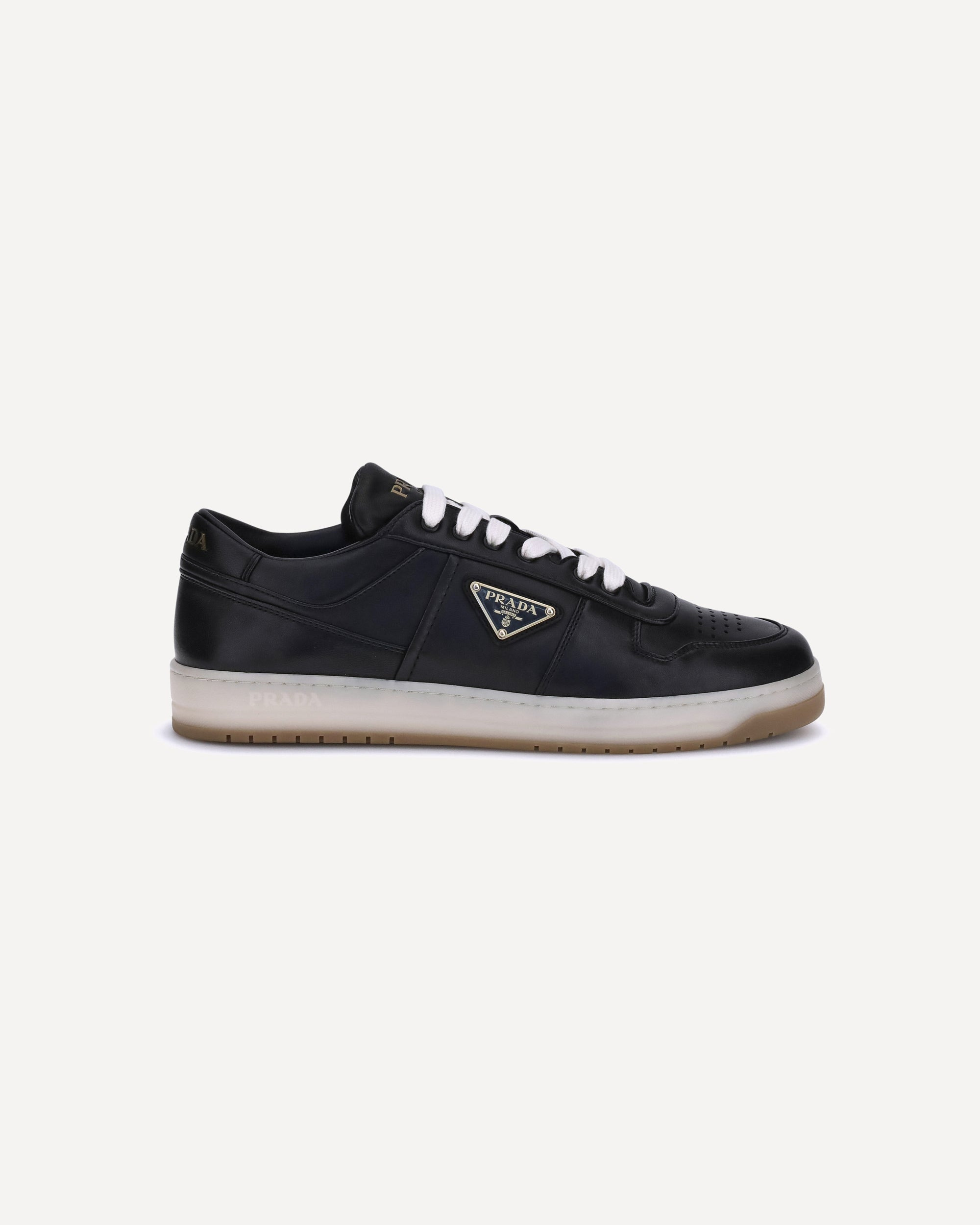 Prada's Downtown leather Sneakers combine sporty lines and iconic details in a refined design. Featuring a paneled construction, they feature a lace-up front closure, perforated round toe and flat sole. The iconic triangular enameled Prada logo plaque decorates the outer side panel, while the heel and tongue are also branded. An essential yet distinctive model, perfect for an urban and elegant style. DETAILS - Sku: 2EE364FD001038_F0632 - Season: AW25 - Composition: UPPER 100% Calf Leather Bos Taurus SOLE 100% Rubber - MADE IN ITALY