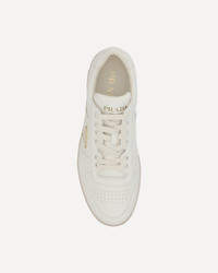 Calfskin Downtown Sneakers by Prada featuring a paneled design, a lace-up front closure, a round perforated toe, an iconic enameled triangular brand signature plaque applied to the outer side panel, a logoed heel and front label, and a flat sole. DETAILS sku 2EE364FD001038_F0304 composition: CALF LEATHER BOS TAURUS 100% RUBBER 100% color group: WHITE gender: MAN season: SS25 size chart: SHOES UK category name: SNEAKERS