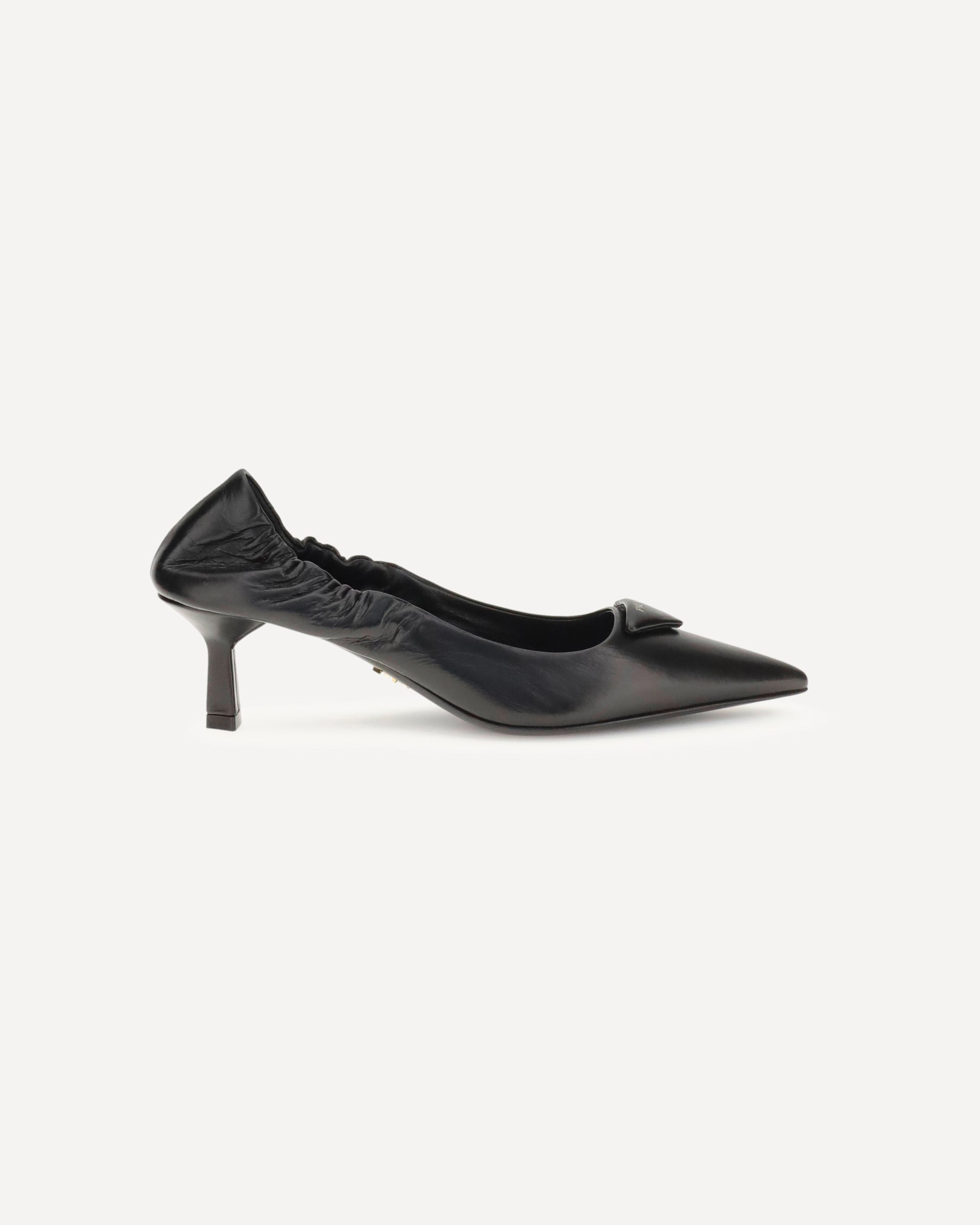 Prada's logo Pumps are made of leather and feature a soft, tapered silhouette. The pointed toe model features a deconstructed design, enhanced by an elastic back that ensures comfort and fit. The architectural heel, inspired by the geometry of Prada's iconic triangle, completes the look with a modern and distinctive touch, while the triangular logo on the front elegantly signs the model. DETAILS - Sku: 1I188OF055070_F0002 - Season: AW25 - Composition: GENERAL 100% Calf Leather Bos Taurus - MADE IN ITALY