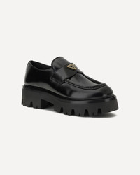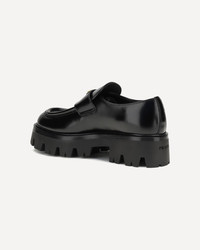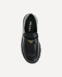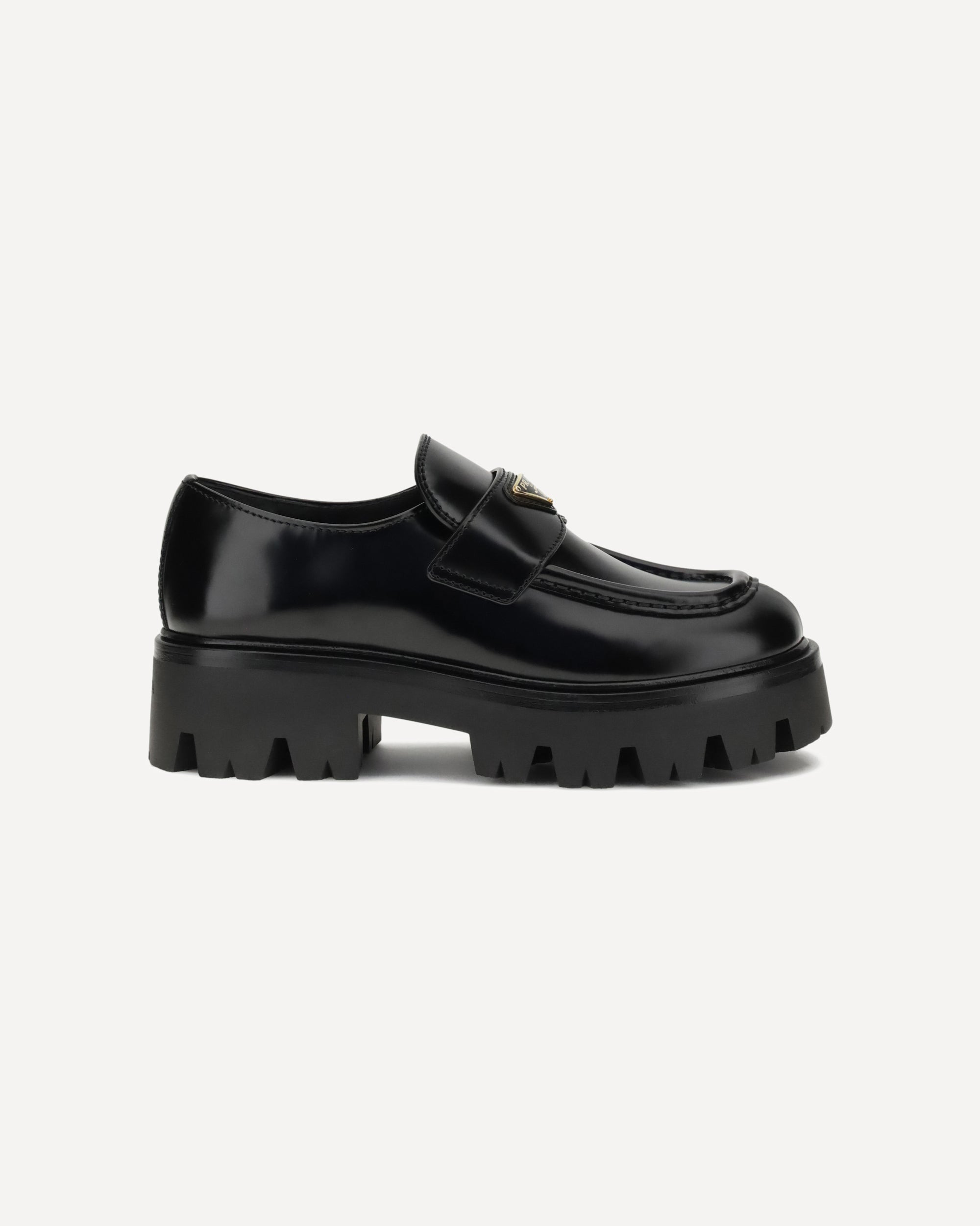 Brushed leather Monolith Loafers by Prada reinterpret a classic with a bold, contemporary twist. Featuring a leather horsebit upper with metallic detail, they have a burlotto bowl and an all-leather lining. The foam sole with block tread gives them lightness, volume and a bold attitude, perfect for completing metropolitan looks with personality. DETAILS - Sku: 1D185OF050055_F0002 - Season: AW25 - Composition: GENERAL 100% Calf Leather Bos Taurus - MADE IN ITALY