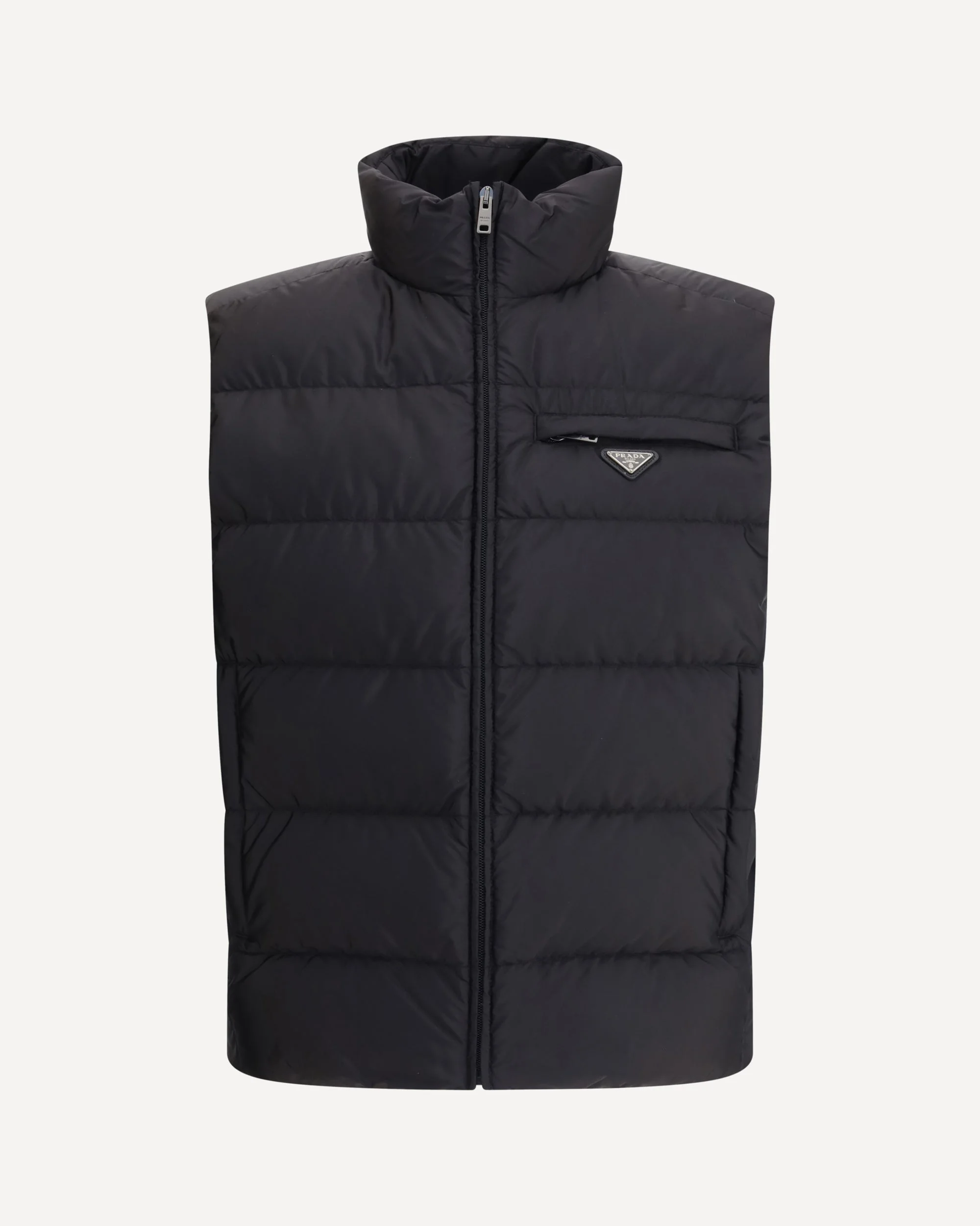Prada's re-nylon Down Vest features a padded and quilted design, ideal for a functional and refined look. It features a zippered front closure, two zippered side welt pockets and the iconic triangular logo plaque applied to the front, a hallmark of the Maison. DETAILS - Sku: SGB033SOOO1WQ9_F0002 - Season: AW25 - Fit: Regular - Composition: OUTER 100% Recycled Polyamide INNER 100% Goose Down - MADE IN ITALY