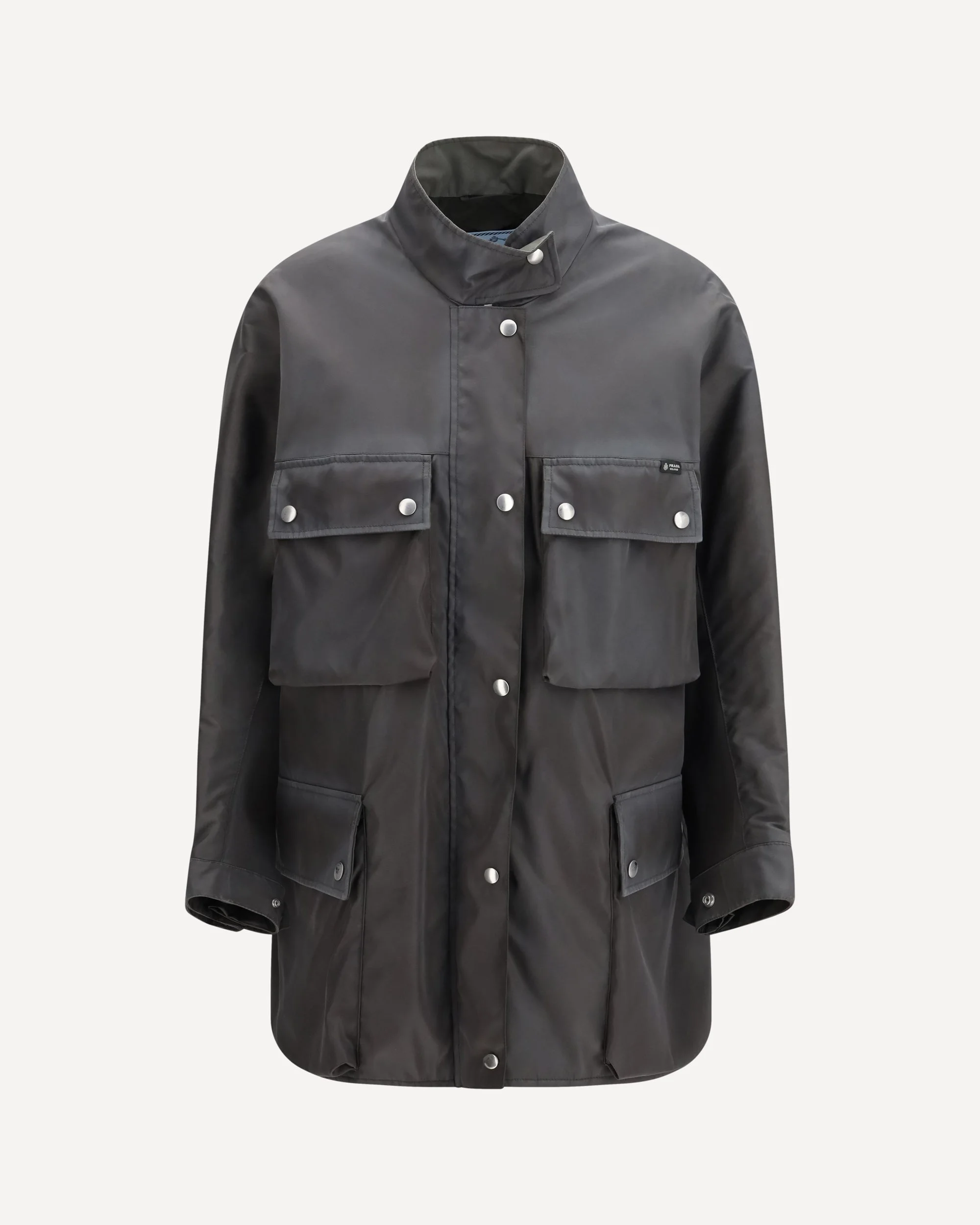 The Re-Nylon Jacket with flap pockets and long sleeves by Prada reinterprets military-inspired aesthetics with a contemporary approach. Crafted from recycled polyamide, it features a washed finish that adds depth to the grey tone and a subtly worn effect. Flap patch pockets highlight its utility character, while the structured construction enhances the silhouette with balance. This Jacket by Prada combines sustainable innovation with functional design in a distinctive modern piece. DETAILS - Sku: 292362SOOO19YE_F0112 - Season: SS26 - Fit: Regular - Composition: GENERAL 100% Recycled Polyamide - MADE IN ITALY