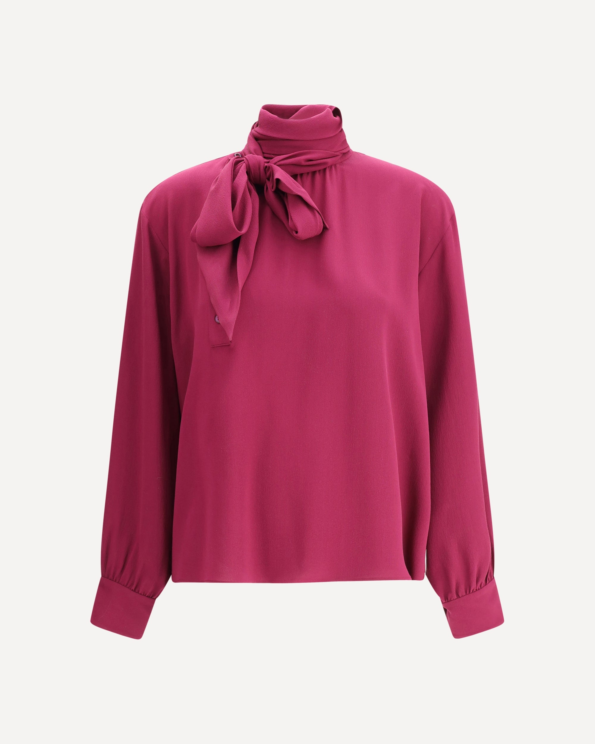 Silk Blouse by Prada has an elegant and feminine design. It features long sleeves, a self-tie sash collar and an off-center button closure at the midsection. The cuffs are adjustable with buttons, while the loose fit ensures comfort and sophistication. An ideal garment for sophisticated looks, both formal and casual chic. DETAILS - Sku: P986MSOOO167C_F0566 - Season: SS25 - Fit: Regular - Composition: GENERAL 100% Silk - MADE IN ITALY