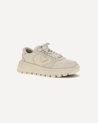 The suede and Re-Nylon Sneakers by Prada combine comfort and modern style. Featuring lace-up closure, they have a padded tongue with embossed logo and a padded ankle for a comfortable and secure fit. The logo printed on the inside adds an extra stylish detail, while the contoured sole provides support and a smooth walk. Perfect for those looking for a sporty look without compromising on quality and sophistication. DETAILS - Sku: 1E021OF045D7C_F0F24 - Season: SS26 - Composition: UPPER 50% Calf Leather Bos Taurus SOLE 100% Rubber UPPER 50% Recycled Polyamide - MADE IN ITALY