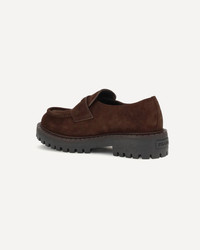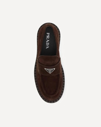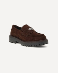 Prada's Suede Loafers combine classic elegance with iconic details. Characterized by the enameled metal triangle logo on the front, they feature a one-piece rubber sole with a branded logo, ensuring comfort and a modern touch. A refined and versatile model, perfect for completing formal or casual looks with discreet distinction. DETAILS - Sku: 2DE151FG001103_F0003 - Season: AW25 - Composition: UPPER 100% Calf Leather Bos Taurus SOLE 100% Rubber - MADE IN ITALY