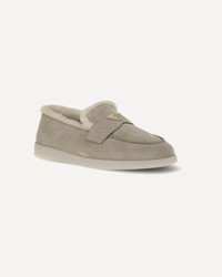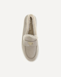 Prada's suede Loafers combine comfort and sophistication in a contemporary design. Featuring a round toe and a soft fur lining, they are embellished with the triangular logo plaque on the front, the house's iconic detail. DETAILS - Sku: 2DG124FA0013LRF_F0FHI - Season: AW25 - Composition: SOLE 100% Rubber UPPER 100% Calf Leather Bos Taurus - MADE IN ITALY