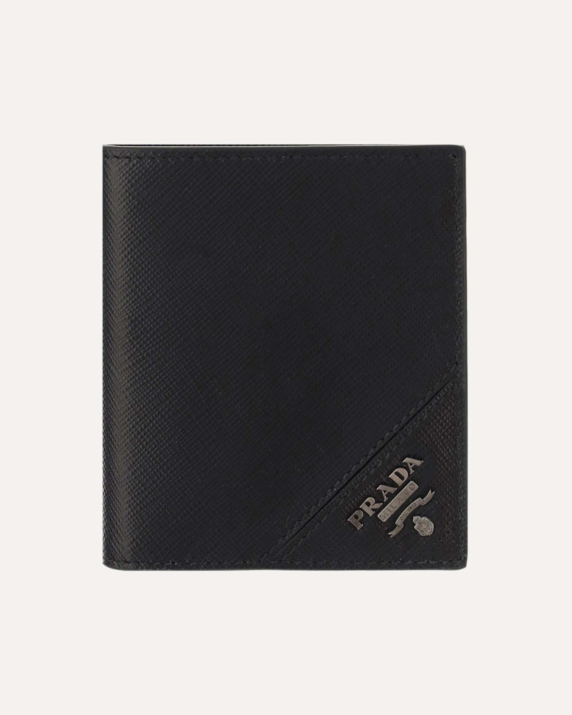 Calfskin Wallet by Prada, metal plate with logo on front, billfold design, slots for cards inside, two open pockets inside, open compartment on top, embossed logo inside. DETAILS sku 2MO004QME_F0002 composition : CALF LEATHER BOS TAURUS 100% color group : BLACK gender : MAN season : AW23 size chart : MAN UNI category name : WALLETS icon : icon dimensions : height 10 CM length 9 CM depth 2 CM