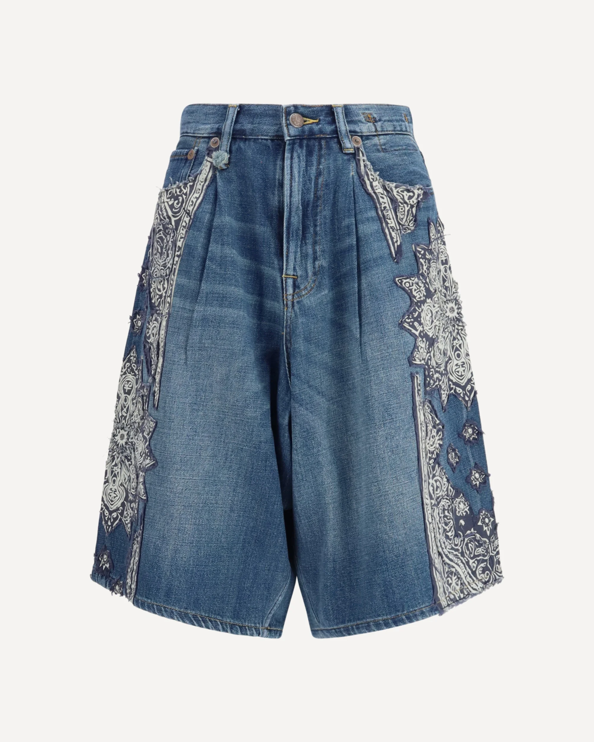 The Cotton Denim Shorts by R13, five-pocket baggy style, front button and zipper closure, waist belt loops, iconic leather patch with signature brand pressure print applied at back. DETAILS - Sku: R13WD152_D447B - Season: SS26 - Composition: GENERAL 100% Cotton - MADE IN CHINA
