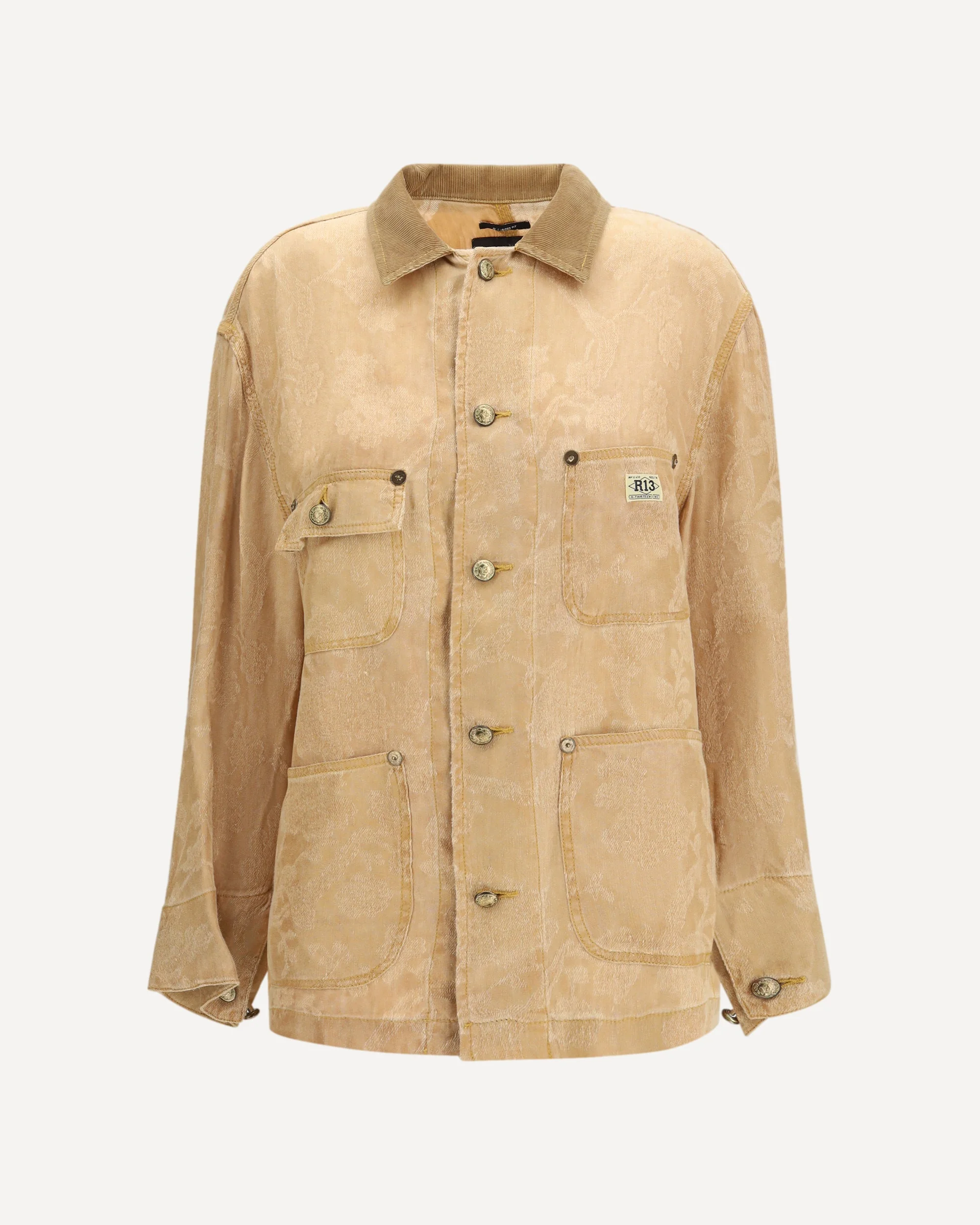 La Evelyn Chore Jacket di R13 reinterpreta il workwear con un’attitudine audace e contemporanea. Caratterizzata da chiusura frontale con bottoni, presenta maniche lunghe e quattro tasche applicate sul davanti che ne enfatizzano lo spirito utility. Il colletto classico in velluto a coste a contrasto aggiunge profondita materica, mentre i ricami all over in tonalita a contrasto definiscono il capo con un forte impatto visivo. Una giacca distintiva che unisce ispirazione heritage e stile moderno. DETAILS - Sku: R13W2324_R715A - Season: SS26 - Fit: Oversize - Composition: GENERAL 81% Linen 19% Viscose - MADE IN U.S.A.