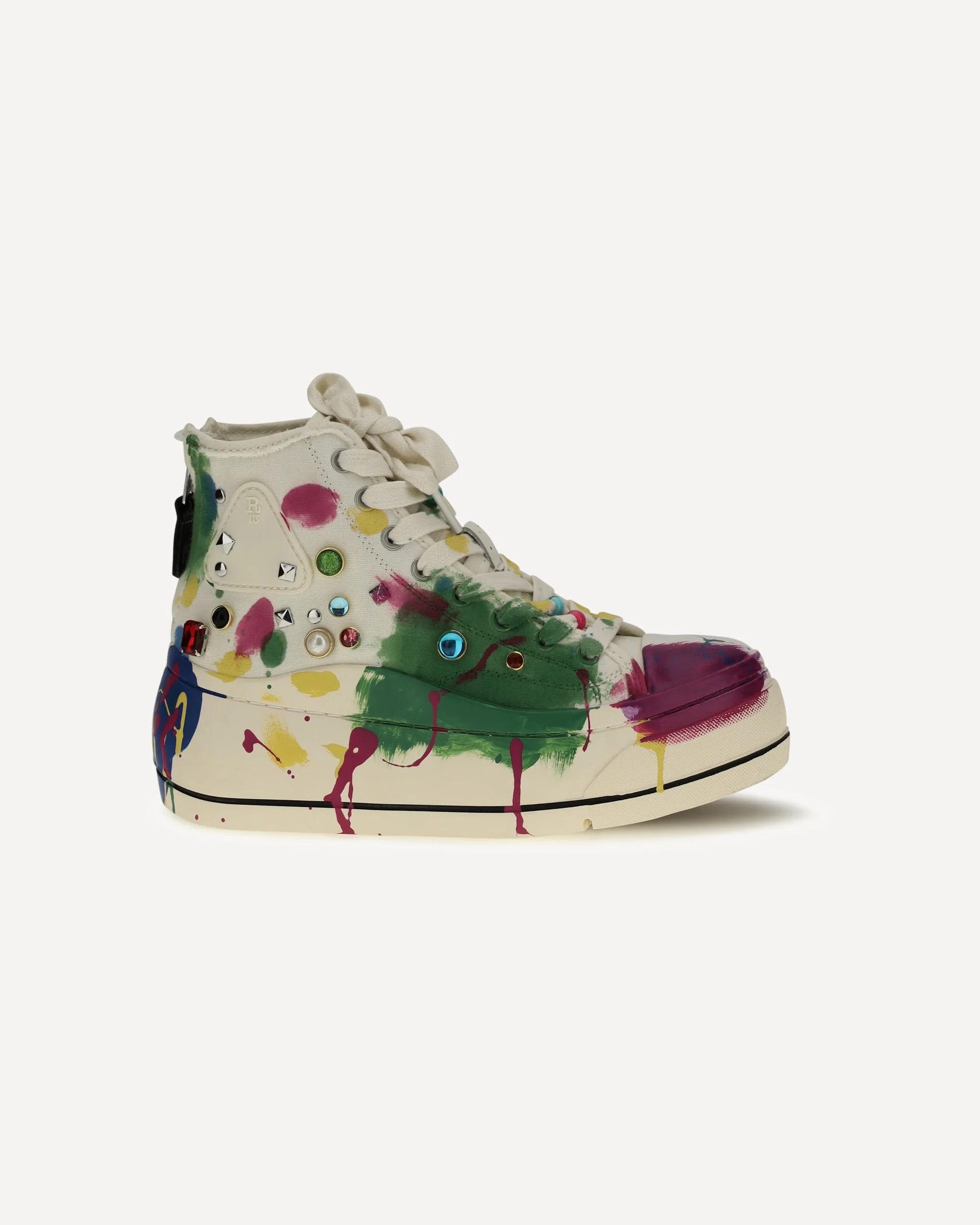 The High Top Sneakers by R13 combine a bold design with a distinctive streetwear touch. The high-leg model with platform adds an element of height and style, while the round toe offers comfort and practicality. The brand logo, embossed on an outer side panel, underscores R13's identity. The lace-up front and zippered heel closure ensure a secure fit. The worn-effect sole gives a worn-in, grunge look, perfect for those looking for sneakers with a unique, contemporary style. DETAILS - Sku: R13S5029_S255A - Season: SS26 - Composition: UPPER 1% Polyurethane SOLE 100% Rubber UPPER 99% Cotton - MADE IN CHINA
