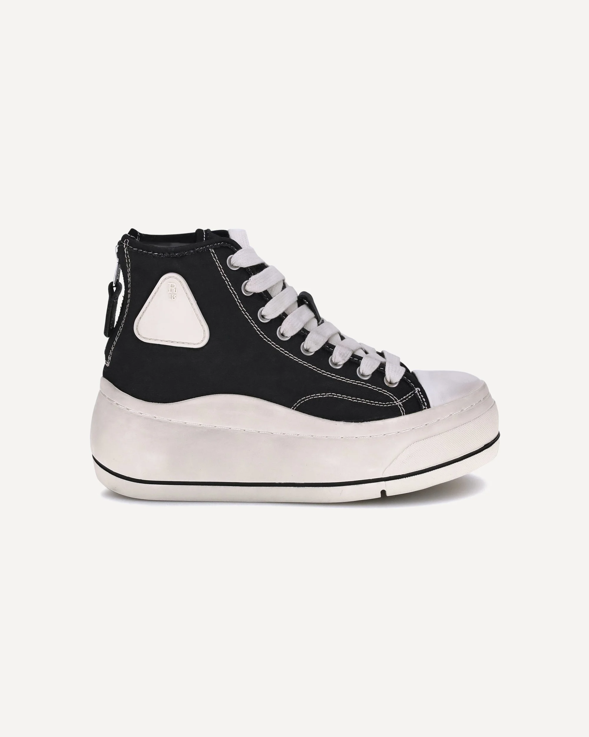 The High Top Sneakers by R13 combine a bold design with a distinctive streetwear touch. The high-leg model with platform adds an element of height and style, while the round toe offers comfort and practicality. The brand logo, embossed on an outer side panel, underscores R13's identity. The lace-up front and zippered heel closure ensure a secure fit. The worn-effect sole gives a worn-in, grunge look, perfect for those looking for sneakers with a unique, contemporary style. DETAILS - Sku: R13S5029_150E - Season: SS26 - Composition: UPPER 1% Polyurethane SOLE 100% Rubber UPPER 99% Cotton - MADE IN CHINA