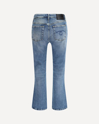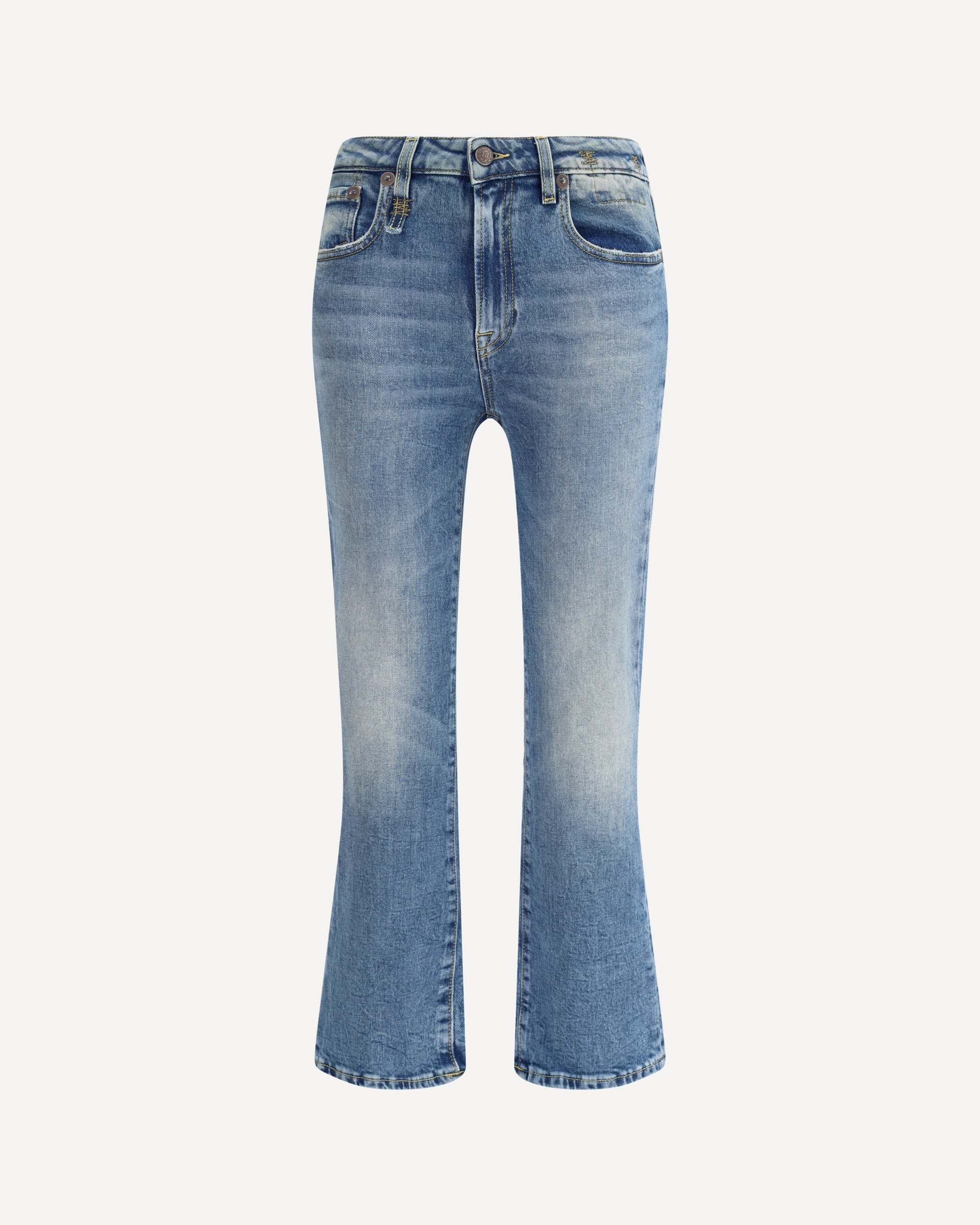 R13's cotton Kick Fit Jeans combine a bold design with distinctive details. Made from denim, they feature an all-over plaid print that adds a twist to the classic five-pocket flare style. The front closure features a button and zipper, while belt loops along the waistband allow you to customize the fit. On the back, the iconic leather patch with the brand's signature press-stamped signature completes the look, lending a sign of authenticity and style. A perfect garment for those seeking comfort and character in one design. DETAILS - Sku: R13W0009_143 - Season: AW25 - Fit: Slim - Composition: GENERAL 97% Cotton 3% Elastane - MADE IN ITALY