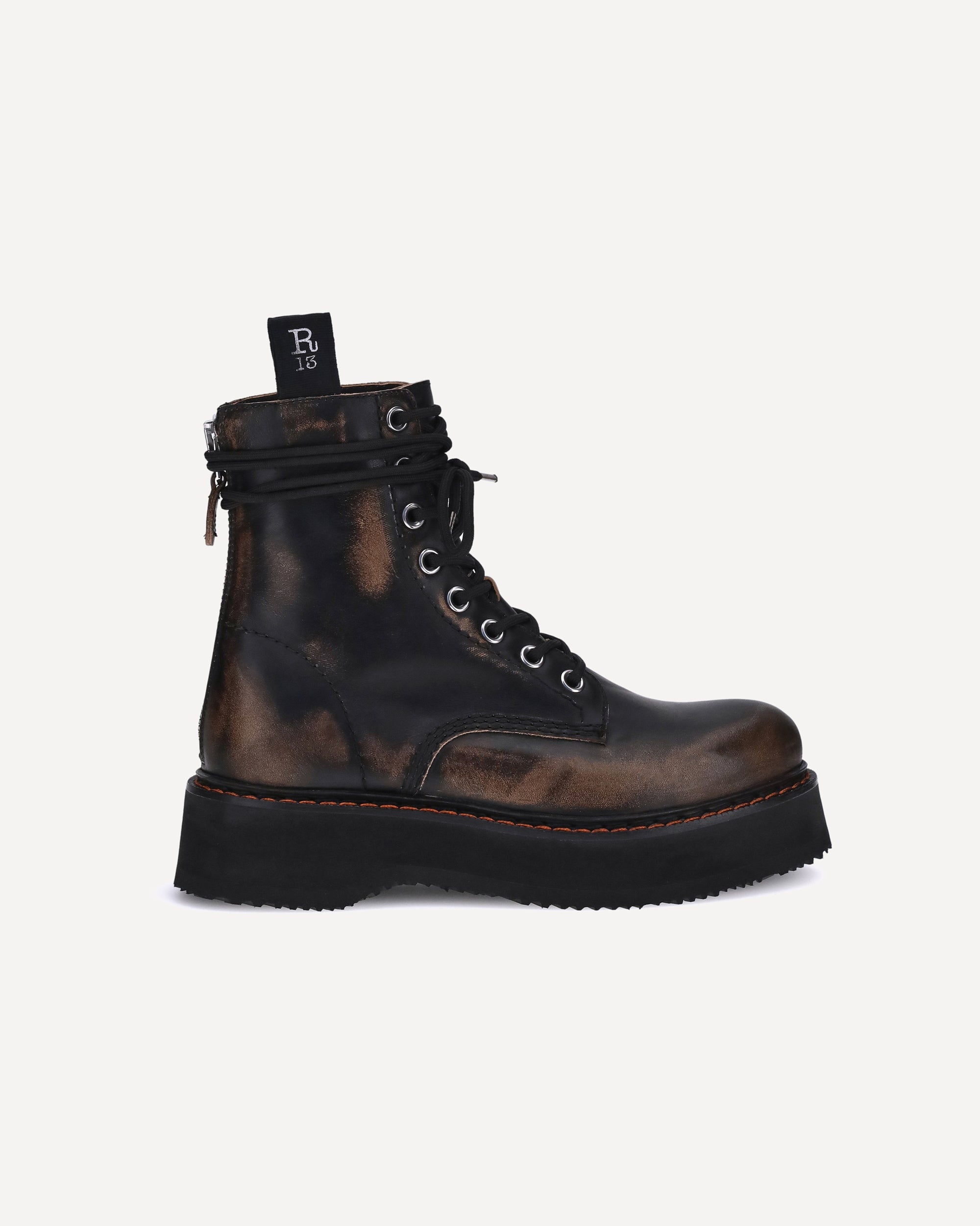 The R13 lace-up Ankle Boots stand out for their platform sole and worn effect that gives them a bold and authentic look. Featuring a zip on the back and branded pullers on the front and heel, they combine practicality and style in a contemporary and decisive design. DETAILS - Sku: R13WS025_R01 - Season: AW25 - Composition: SOLE 100% Rubber UPPER 100% Calf Leather Bos Taurus - MADE IN CHINA