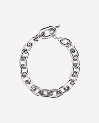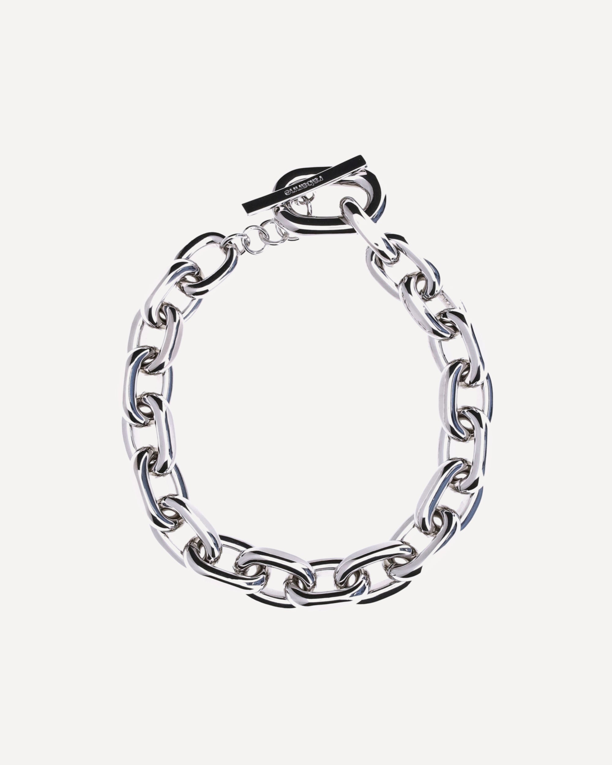 Rabanne's XL Link chain Necklace is a piece of jewelry with a bold, contemporary character, featuring oversized links that define its bold style. Crafted with attention to detail, it features an adjustable clasp closure embellished with logo lettering, adding an iconic touch. With a length of 38 cm, it is perfect to wear as a statement piece to complete minimal looks or enhance more sophisticated outfits. DETAILS - Sku: 20HBB0015MET077_P040 - Season: AW25 - Composition: GENERAL 95% Alluminio 5% Brass - MADE IN ITALY