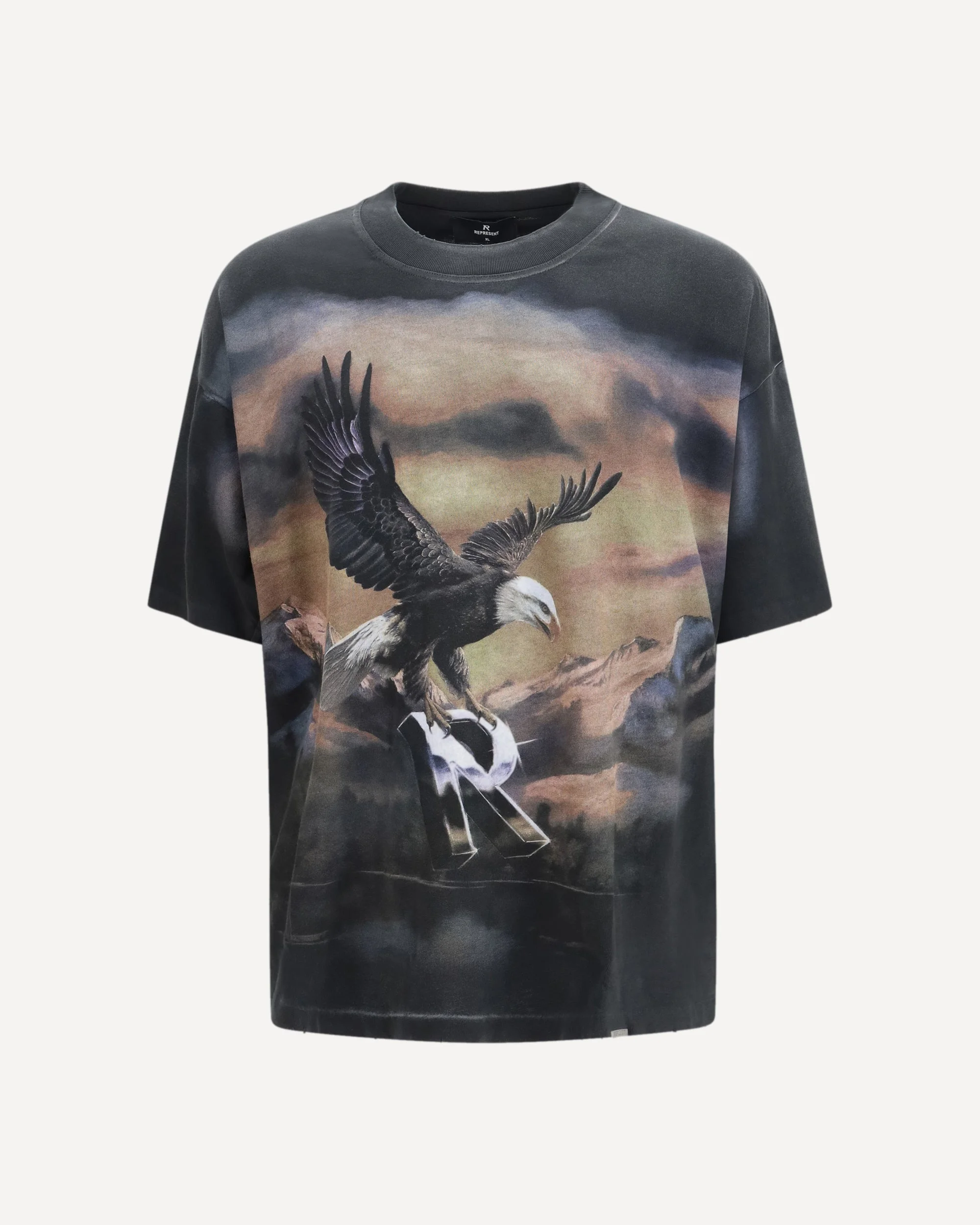 The Chrome Flight T-shirt by Represent, made from high-quality cotton, combines comfort and urban style with a distinctive design. The short sleeves and ribbed edges finished with a distressed effect create a worn and authentic look. The raglan shoulders ensure greater freedom of movement, while the contrasting logo prints on the front and back add character and a touch of originality to the garment. Perfect for those looking for a casual look with personality. DETAILS - Sku: MLM100761_STAINEDBLA - Season: SS26 - Fit: Oversize - Composition: GENERAL 100% Cotton - MADE IN PORTUGAL