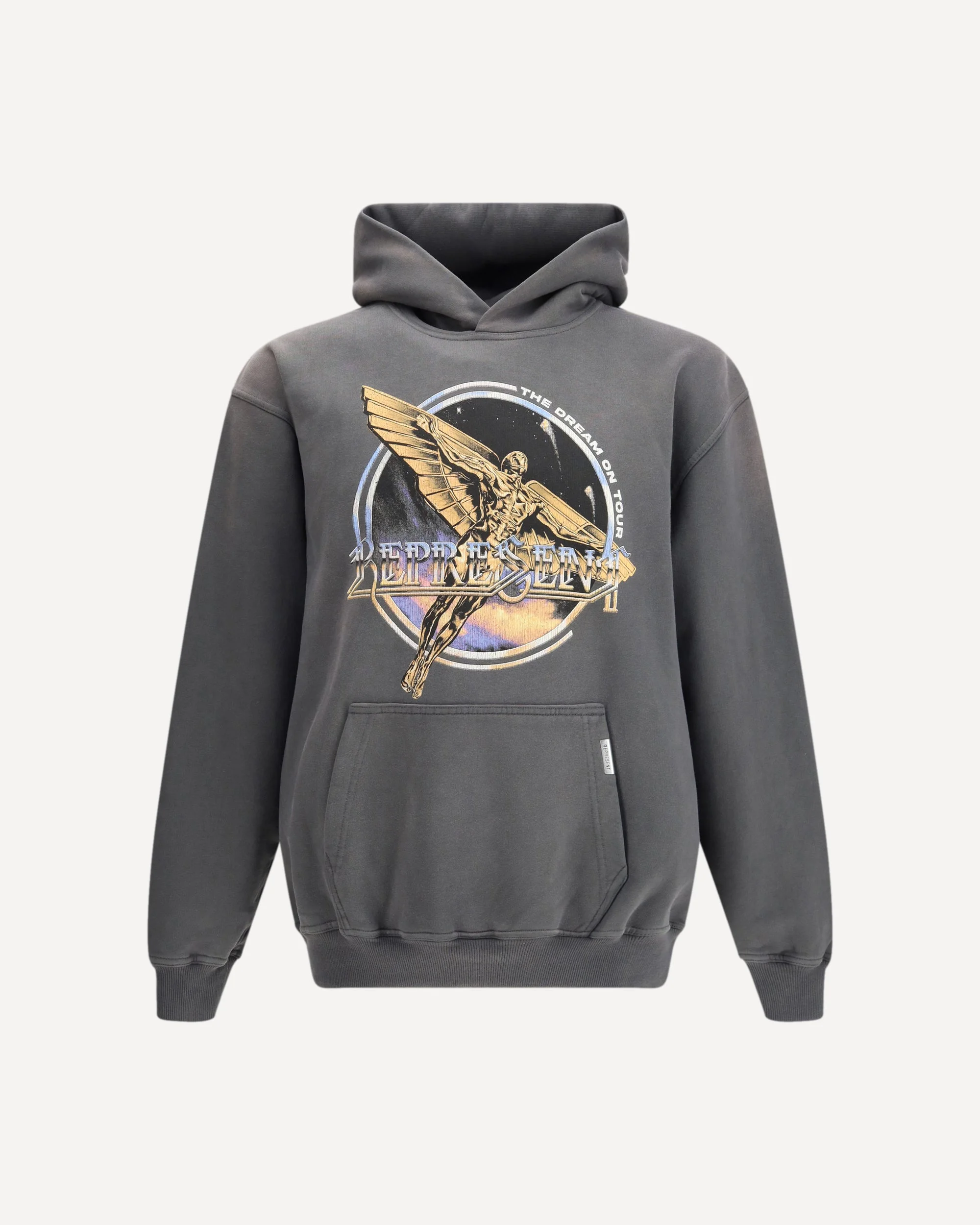 The Golden Tour Hoodie by Represent is a comfortable, urban-style hoodie with ribbed cuffs and hem for a perfect fit. The kangaroo pocket on the front and maxi print on the chest and back make this hoodie bold and on-trend, ideal for a casual yet distinctive look. DETAILS - Sku: MLM100822_SUNFADEGRE - Season: SS26 - Fit: Regular - Composition: GENERAL 100% Cotton - MADE IN PORTUGAL